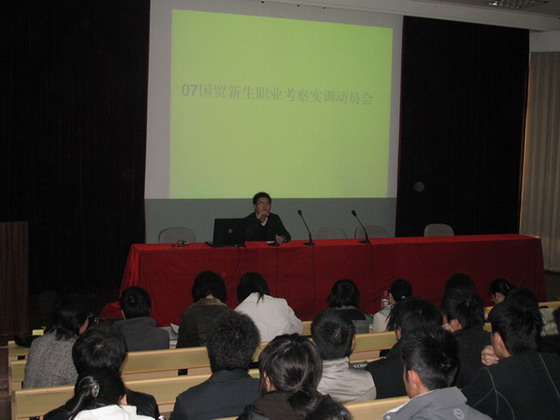 2007年12月5日上午,外经系国贸教研室在实验楼一楼报告厅举行了07级新生职业考察实训动员大会,由实践教研室主任林昌平主持,先由外经系主任贺存乡老师给同学和老师们做了主题发言,她从职业考察实训的目的、意义、内容、形式,要求等五个方面作了动员,接着国贸教研室主任郭爱美老师就具体职业考察实训安排进行了布置。最后,还邀请了学院国际交流中心于强老师给同学和老师们做了主题为“人生规划和出国留学”的精彩讲座。这些都给同学和老师们留下深刻印象。同时也拉开了国贸专业07级新生职业考察实训的序幕。同学们满怀兴奋,跃跃欲试,都表示要认真实训,象重视课堂学习那样重视实训,争取好成绩,圆满完成任务!