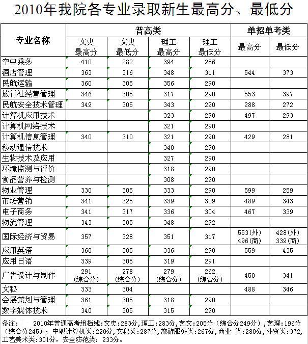 我院2010年各专业录取新生最高分和最低分