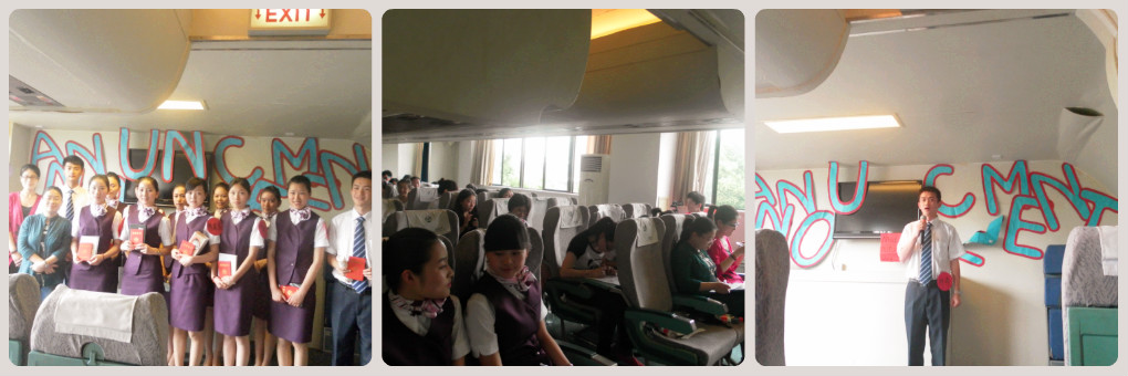 本次比赛分为两个环节,第一环节为小组合作表演客舱服务,并在每组选手中淘汰得分最低的同学;第二环节是每个选手根据参赛编号进行随机抽签编播广播词,最后两个环节的的累积分数为选手的最后得分。今天站在这里的同学都是各路强手,他们都是从初赛中选出来的精英。随着一阵掌声比赛开始了,只见一个个身着制服的选手自信满满地走进了客舱。第一组的精彩表演为整个比赛开了一个很好的头。随后几组的表演也相当的好,成员之间配合很默契。经过两轮紧张的表现,比赛最后由11空B的许涛同学荣获冠军。