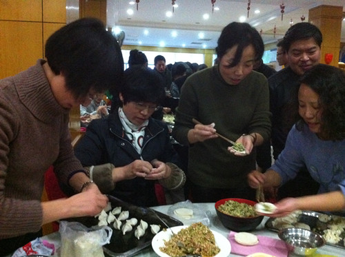 经济贸易系所有参加活动的人员围在一起,拿出了各自的绝活,一个个形状各异的饺子就新鲜出炉了。赶快拿去蒸熟!不一会儿,食堂窗口的工作人员大声叫着“经贸!经贸!”有人飞奔而去,热腾腾的饺子来啦!大家凑在一起,热热闹闹吃饺子,欢欢乐乐迎元旦。