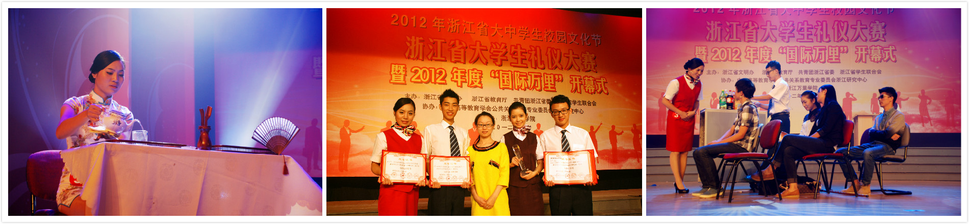 2012年10月13—14日,2012年浙江省大中学生校园文化节——浙江省大学生礼仪大赛在宁波举行。我院民航与旅游分院学生方俊杰、程隆、徐敏、张严艺组成的“梦之蓝”代表队以全面的礼仪知识、精彩的才艺展示、和出色的情景模拟展示在全省20支本、专科院校参赛队伍中脱颖而出,获得团体二等奖。在本次大赛中,张严艺同学还被评为“十佳礼仪使者”,吕串和欧阳驹老师被评为“优秀指导老师”。