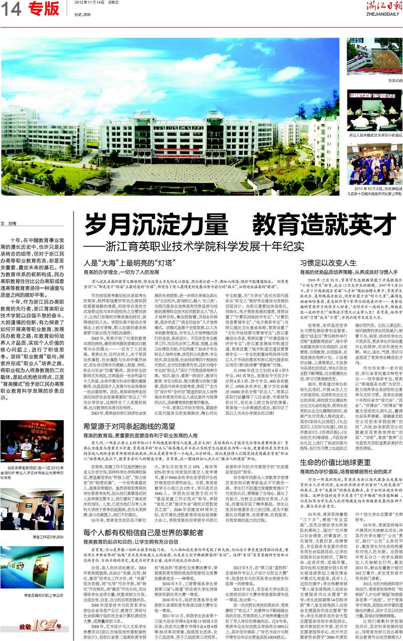 十年,作为浙江民办高职教育的先行者,浙江育英职业技术学院以自强不息的奋斗、大胆谨慎的创新,有力探索了如何开展高等职业教育、发展民办教育之路,在教育如何培养人才品质、实现个人价值的核心问题上,进行了积极思考。坚持“职业教育”取向,探索并形成“职业人”培养之路,将职业视为人终身教育的二次载体,是起点而绝非终点,正是“育英模式”给予浙江民办高等职业教育科学发展的珍贵启示。