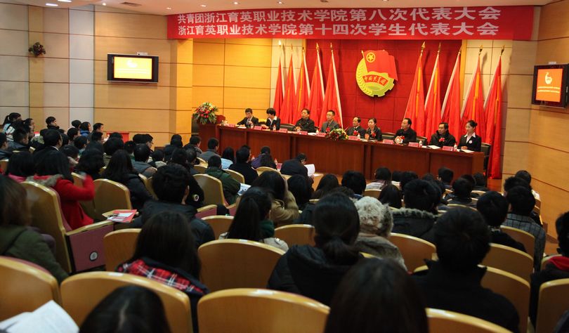 1月5日,学院第八次团员代表大会、第十四次学生代表大会在学术报告厅隆重举行。学院党委书记、院长洪致平,副书记、副院长周治斌,副院长陈六明、秦学礼,学院工会主席王近安,党委委员、人事处长、组织部长谢鑫,学生处长王敏,团委书记邬佳,学生会主席雷献君出席。共青团杭州市委学校部部长茹意,开发区团工委书记李征,杭州师范大学团委书记董伟及多所高校团委书记应邀出席,茹意、王近安、董伟致贺词。双代会主席团成员及全体代表226人参加会议。