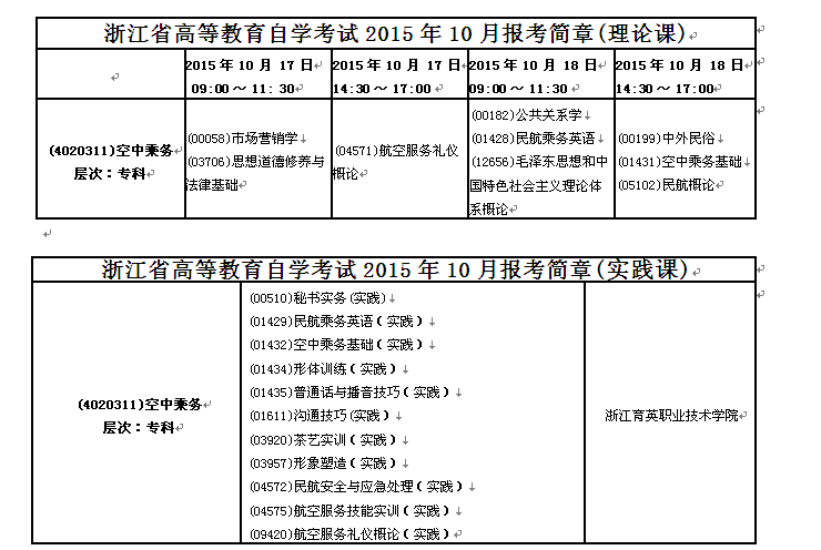 14级:实践首报4课:(01434)形体训练(实践),(01435)普通话与播音技巧(实践),(03957)形象塑造(实践),(09420)航空服务礼仪概论(实践)。