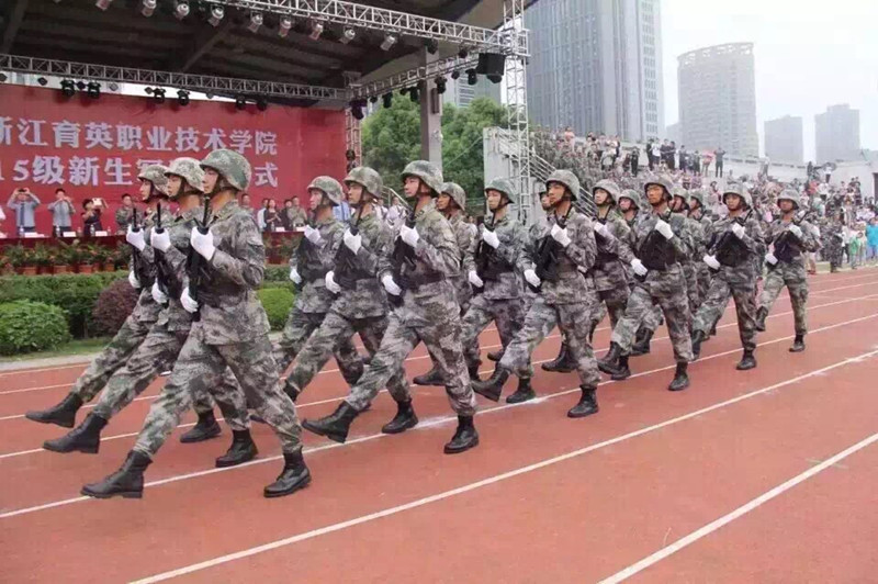 9月28日,毛毛细雨中,浙江育英职业技术学院2015级新生完成为期15天的军训,各连队依次在田径场列队接受检阅。院长洪致平,党委书记、常务副院长、军训团政委王锡耀,73021部队直工科科长房凯,副院长黄爱平,党委副书记、院长助理、军训团副政委谢鑫,院长助理、军训团副团长王敏,部队政工组长、少校钱卫军,军训团团长章四海以及各分院系部、相关行政部门负责人在主席台就座。洪致平向73021部队赠送锦旗。