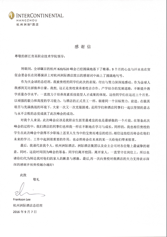 9月19日,二十国集团工商峰会杭州洲际酒店员工答谢会举行。我院应邀出席。会上,杭州国际会议中心总经理陈晓女士宣读感谢信,并向我院党委副书记、副院长谢鑫赠送B20峰会保障服务优秀合作院校牌匾。