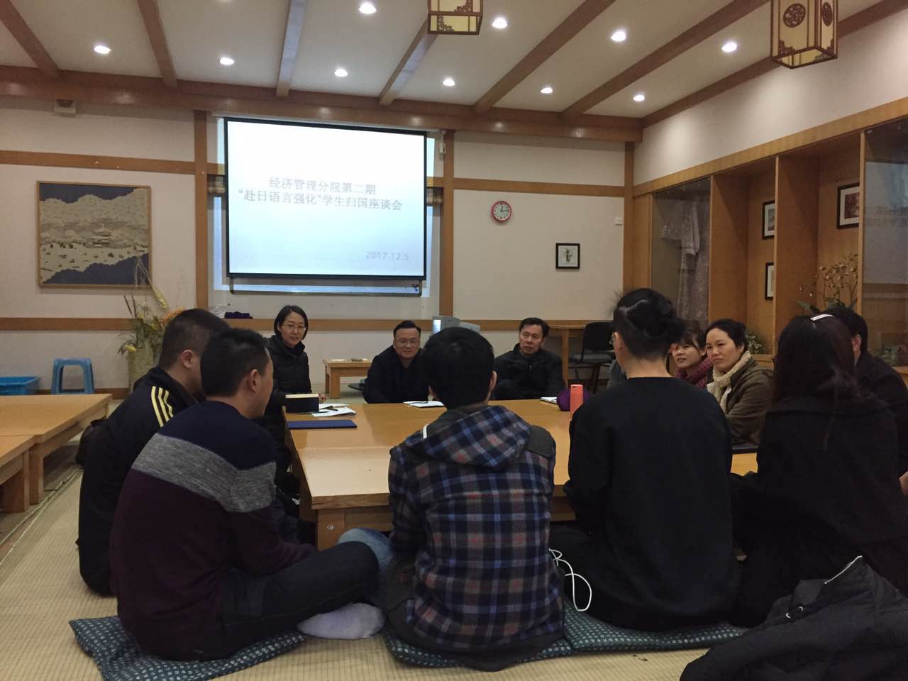 育英学子重归育英课堂后,为了进一步了解学生情况,2017年12月5日第二期“赴日语言强化”归国学生座谈会在3109日本文化习俗实训室举行。学院王敏院长,经济管理分院周岚院长,谢剑峰书记,应用日语教研室主任张东亚,教师刘星、张婵娟、傅晶、何露丹以及8名归国学生出席。会上学生表示日本有安静、干净、有秩序的环境,高素质的国民,动漫天堂秋叶原,人性化的交通等,有很多值得我们学习的地方。