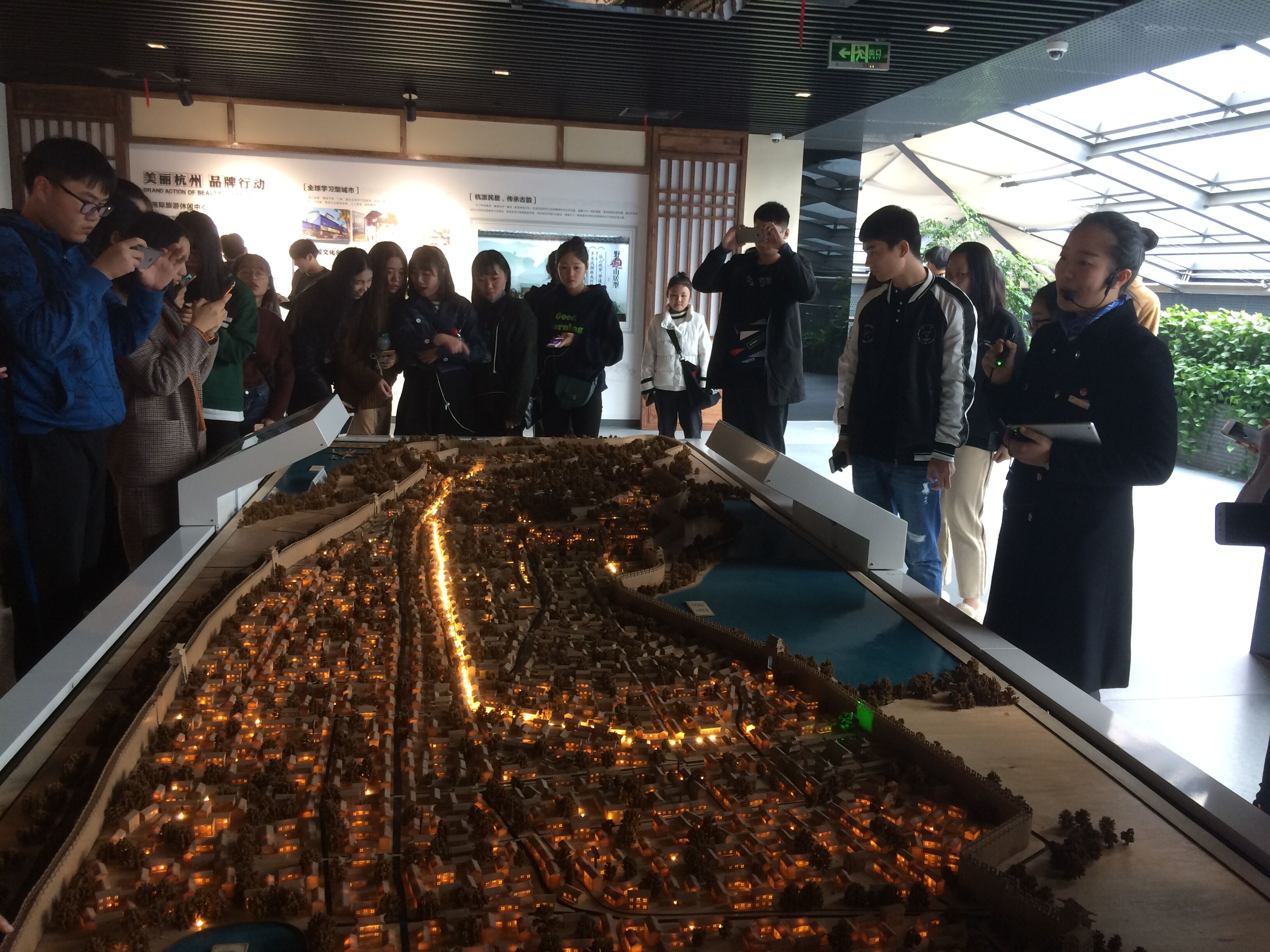 师生们井然有序地跟随讲解员参观了序厅、“印象杭州”、“解读杭州”和“展望杭州”四个展厅,认真观看了城市记忆、名城保护,蓝图总绘、通达出行、基础命脉、网络都市等主题展区,深入了解了杭州古都文化名城的悠久历史,当今城市的规划建设,以及展望生活品质之城的美好未来。展览馆一层介绍了杭州市地理位置、经济概况、气候条件等基本信息,为参观拉开了序幕。二层分为“城市记忆”、“名城保护”、“山水城市”三个篇章,展示了杭州城市的发展历程,从古至今全面介绍了杭州城的形成及在保护老城建设新城中的种种变迁。三层则设有公共设施规划展区、住宅规划展区、综合交通规划展区及总体规划展区,展示了杭州城市发展的蓝图。四层设有环幕影院、总体规划大型城市模型展示。