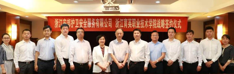 5月30日上午,浙江育英职业技术学院与浙江安邦护卫安全服务有限公司战略合作签约仪式在学院十楼会议室举行,民航交通分院赵淑桐院长和黄云董事长分别代表校企双方领导签订战略合作协议、相互交换授牌。仪式由学院王敏副院长主持,学院院长盛健、公司董事长黄云出席仪式并致辞。