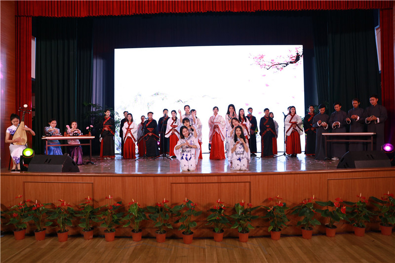 12月28日晚,“砥砺奋进 筑梦远航”2019元旦文艺晚会暨优秀学生颁奖典礼在学院体育馆举行。我院老挝留学生的歌舞节目《中华诗情》作为压轴节目又着实让全院师生眼前一亮。这些来自异国他乡的孩子们,身着汉服,在琵琶的伴奏下,齐声吟唱李白的《静夜思》。留学生陆娅和桑达雯在一旁以娴熟、优雅仪态向现场观众展示茶艺;四名男生在歌声的伴随下,在舞台上沉着地描画着京剧脸谱。