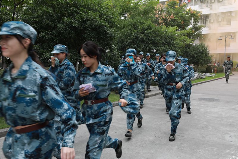 演练结束后,军训团团长刘建进行点评,充分肯定此次演练的成功,并提出其中的不足之处,强调应急事故发生后应如何自救和逃生的注意事项。