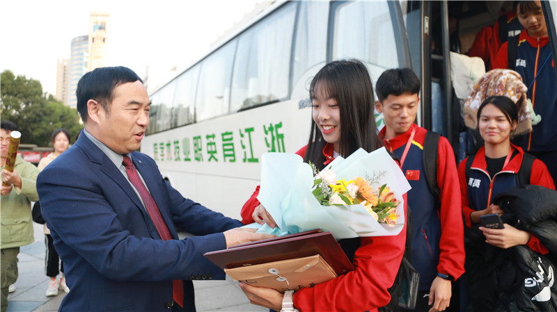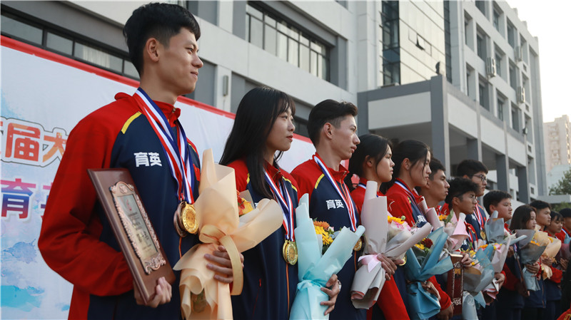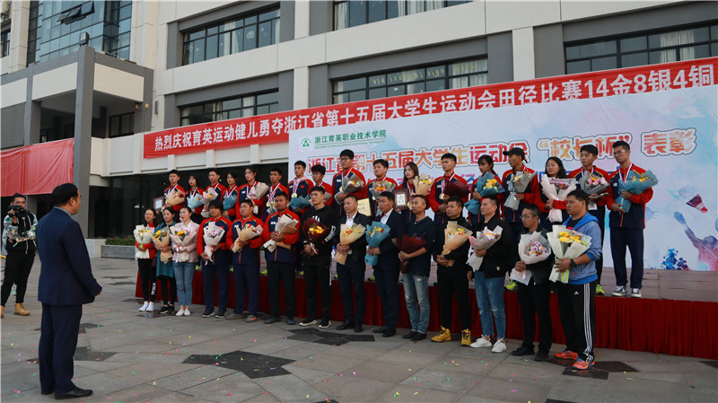 11月10日下午,育英学院教学区广场礼花飞舞,喜气洋洋。学院隆重举行浙江省第十五届大学生运动会“校长杯”表彰暨欢迎育英田径健儿凯旋仪式。早已等候在广场上的学生代表为运动员和教练员献上鲜花。