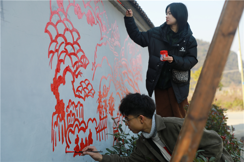 创意设计分院“活力墙绘设计进农村文化礼堂”小分队来到建德市乾潭县幸福村,开展以“墙艺色彩,文化长廊”为主题的社会实践活动。墙绘作为建筑物的附属部分,其装饰和美化功能使它成为环境艺术的一个重要方面。同学们们用幸福的红色在雪白的墙面上诠释了幸福的真谛。画中村落依山傍水,良田环绕,一片欣欣向荣的景象,这正是幸福村的真实写照。“幸福村居”四个大字更是表达了村民们对“村居幸福”的美好愿景。