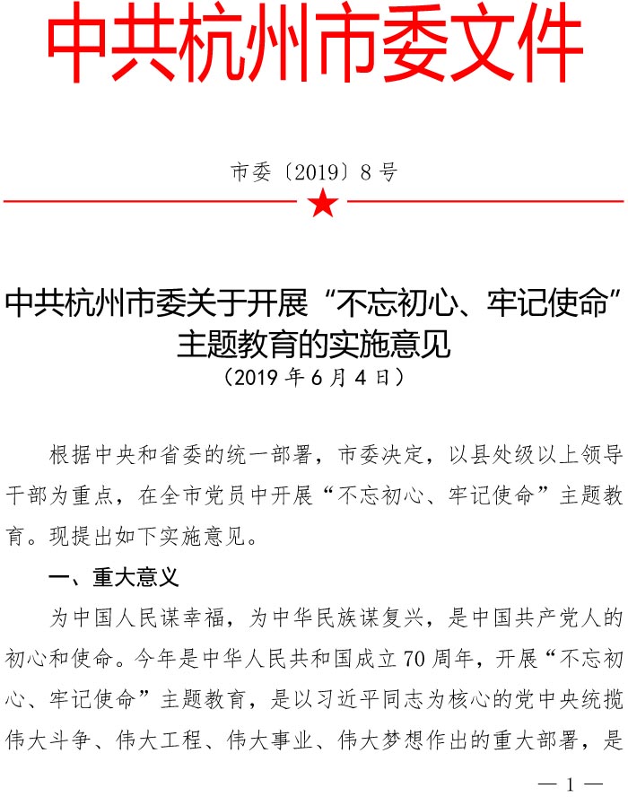 中共杭州市委开展“不忘初心,牢记使命”主题教育的实施意见