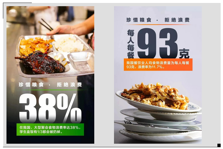 我国餐饮业人均食物浪费量为每年每餐93克,浪费率为11.7%。在我国大型聚会食物浪费率达38%,学生盒饭有1/3都会被扔掉。