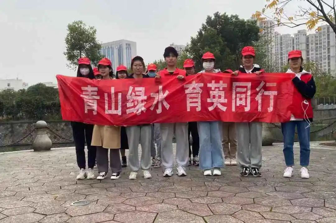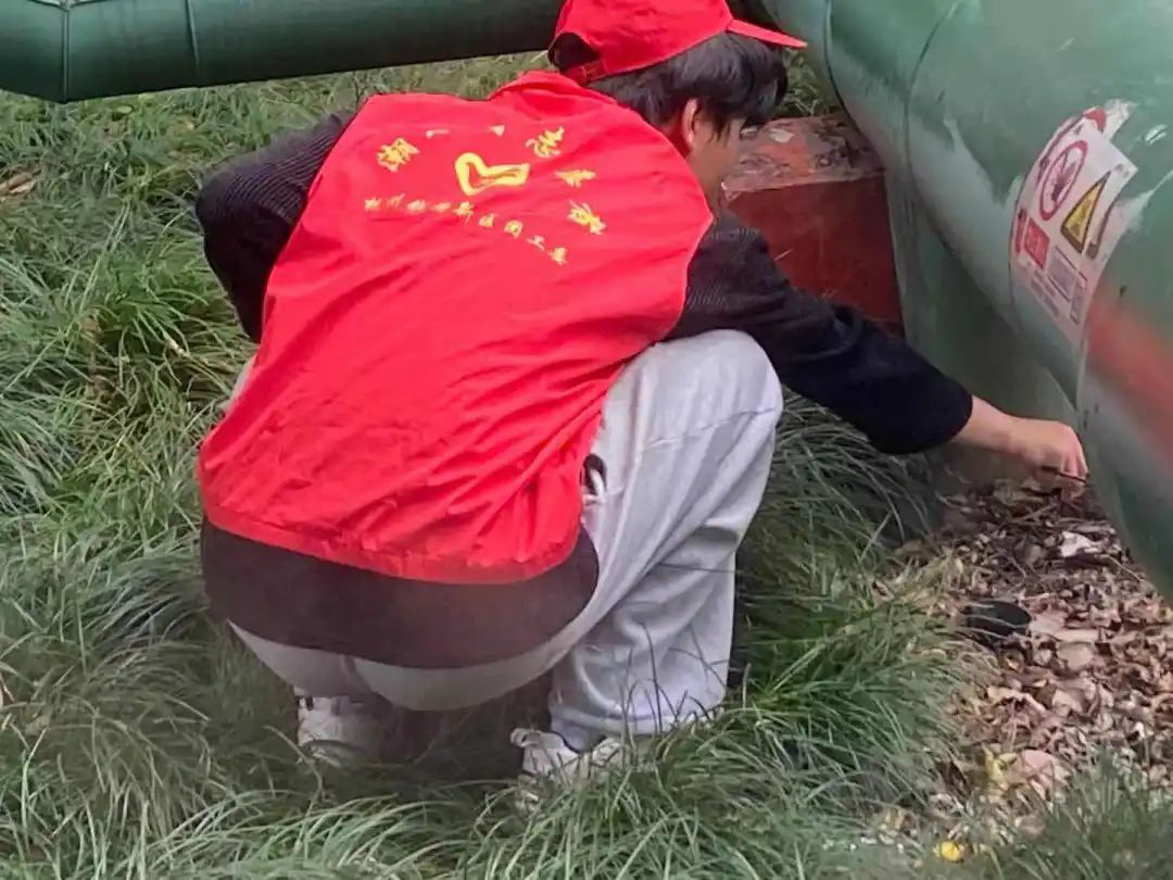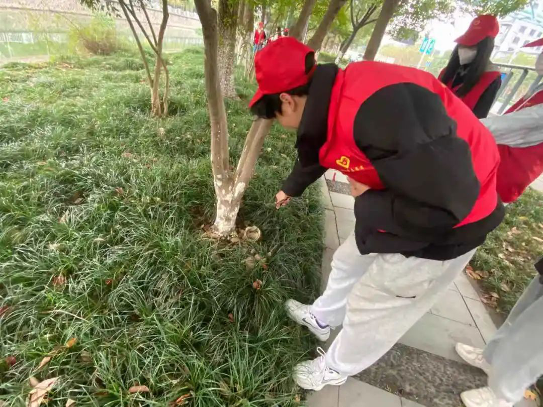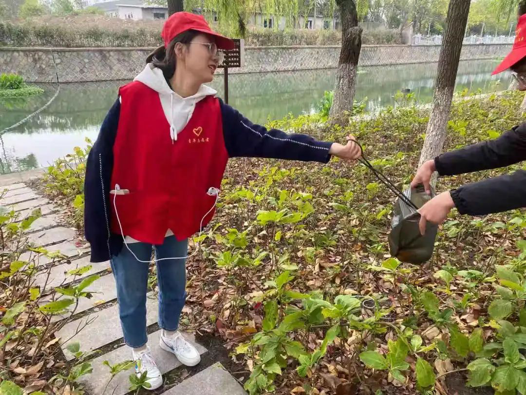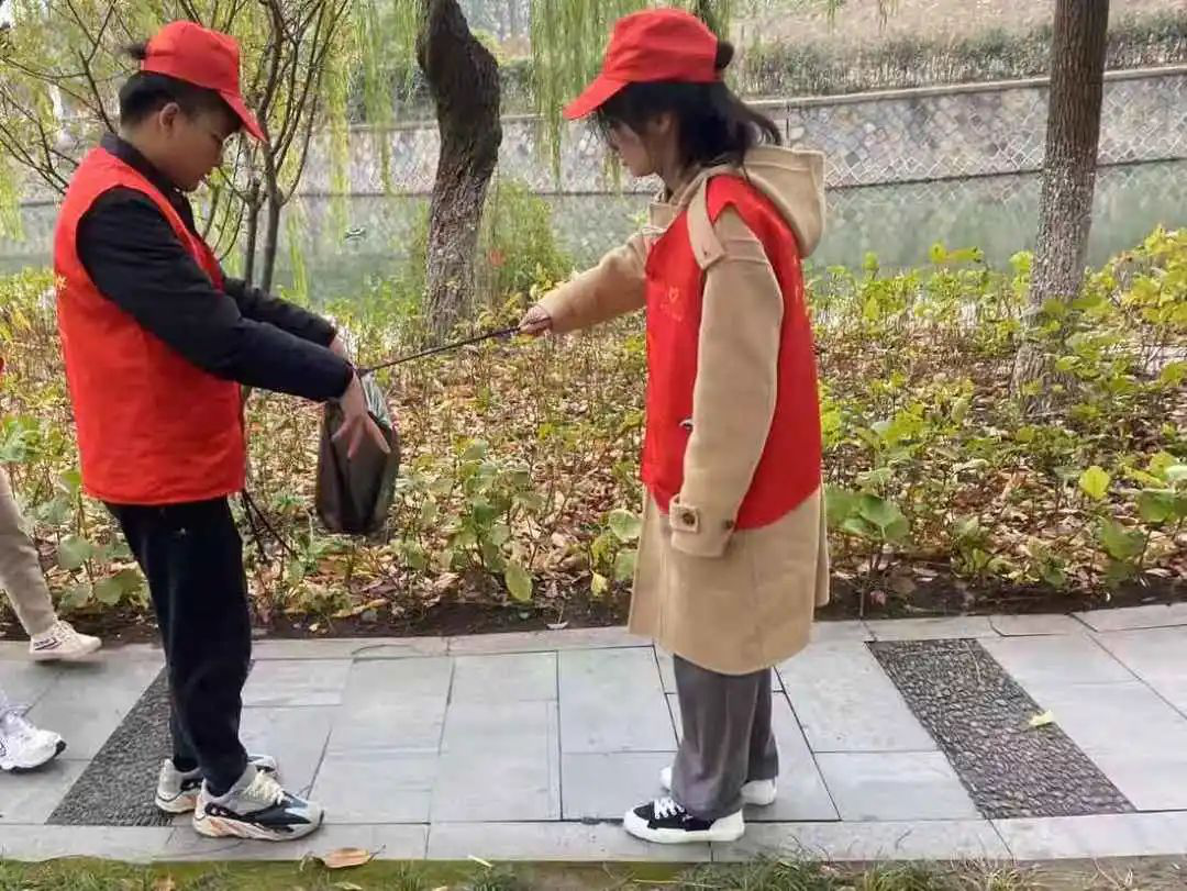 他们穿上代表学院红马甲,戴上红帽子。拿着火钳和垃圾袋一起来到河边捡垃圾。