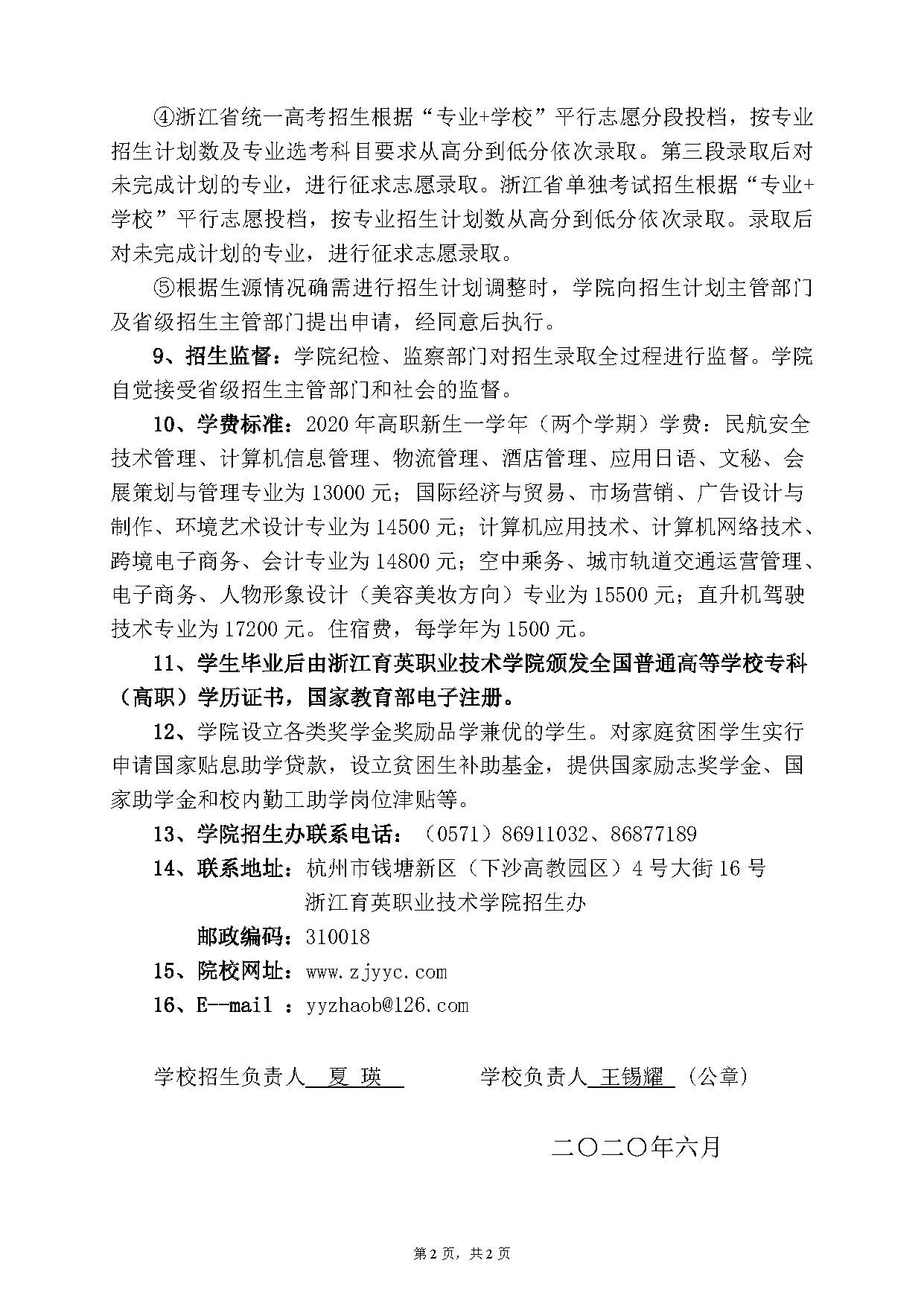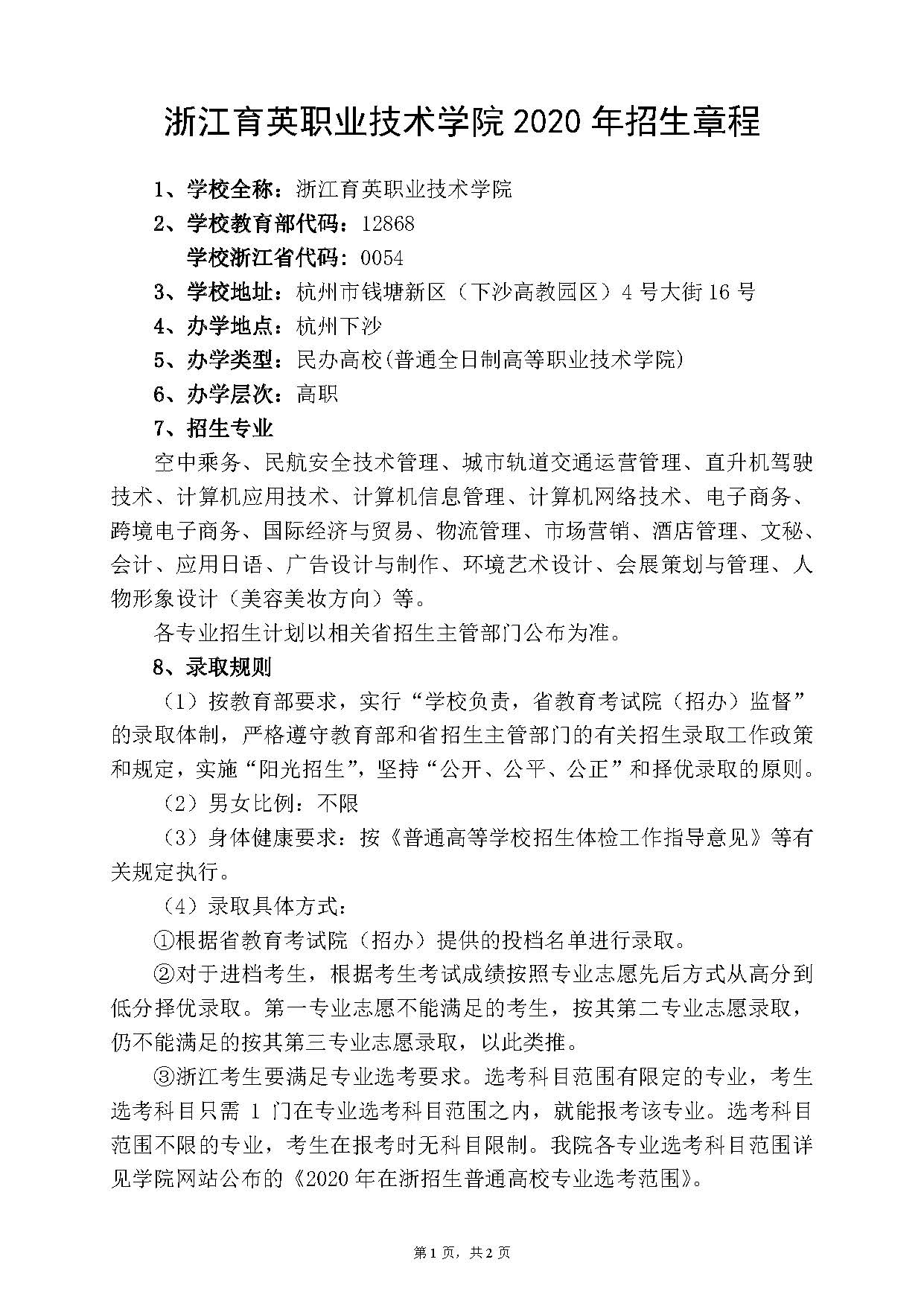 浙江育英职业技术学院2020年招生章程