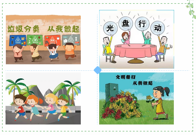 积极参与学校爱国卫生月 “光盘行动”“垃圾分类”“快乐跑操”“文明祭扫”等主题活动;把文明健康、绿色环保生活方式融入到日常工作、学习和生活中来。做文明健康的先行者。