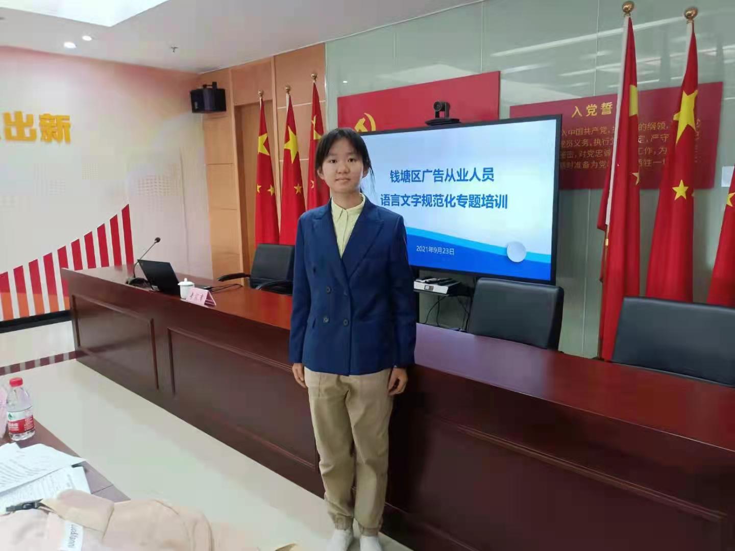9月23日,分院20广告B班张觉文同学作为专业的学生代表受邀参加由杭州钱塘新区语言文字工作委员会办公室主办的广告从业人员语言文字规范化专题培训,张觉文身着正装,与30余位广告从业人员一起参加培训,区市场监管局负责广告法主讲广告的基本法则,区语委办要求语言文字专家对广告规范用词进行了培训,3个小时的培训,让同学认识到了很多课堂上不曾涉及的专业指示,感受颇深。(广告教研室 郭恩文报道)