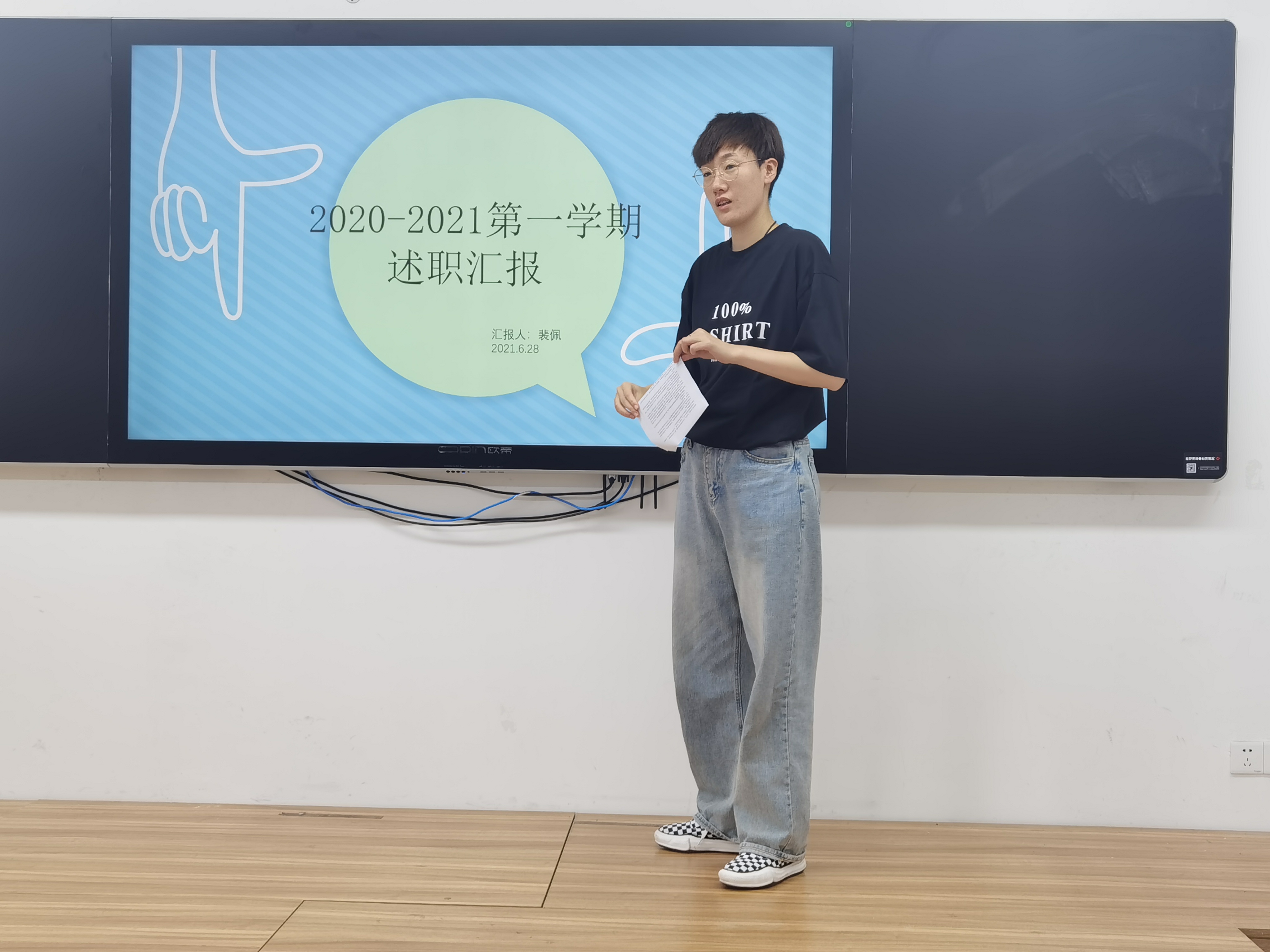 第二个进行述职汇报的是裴佩老师,她从日常管理生活、思想政治教育、学生活动及个人发展四个方面进行了汇报,她讲到本学期所带的班级为19文秘、20会计A,B、20文秘四个班级共198名学生,学期中经历过几起学生事件,但总体来说是平稳度过的。在教育过程中,面对学生的问题行为,裴老师真诚地帮助他们,关心他们,体贴他们,站在他们的角度去看问题,想问题,对待问题,处理问题,最后都得到了妥善的处置。