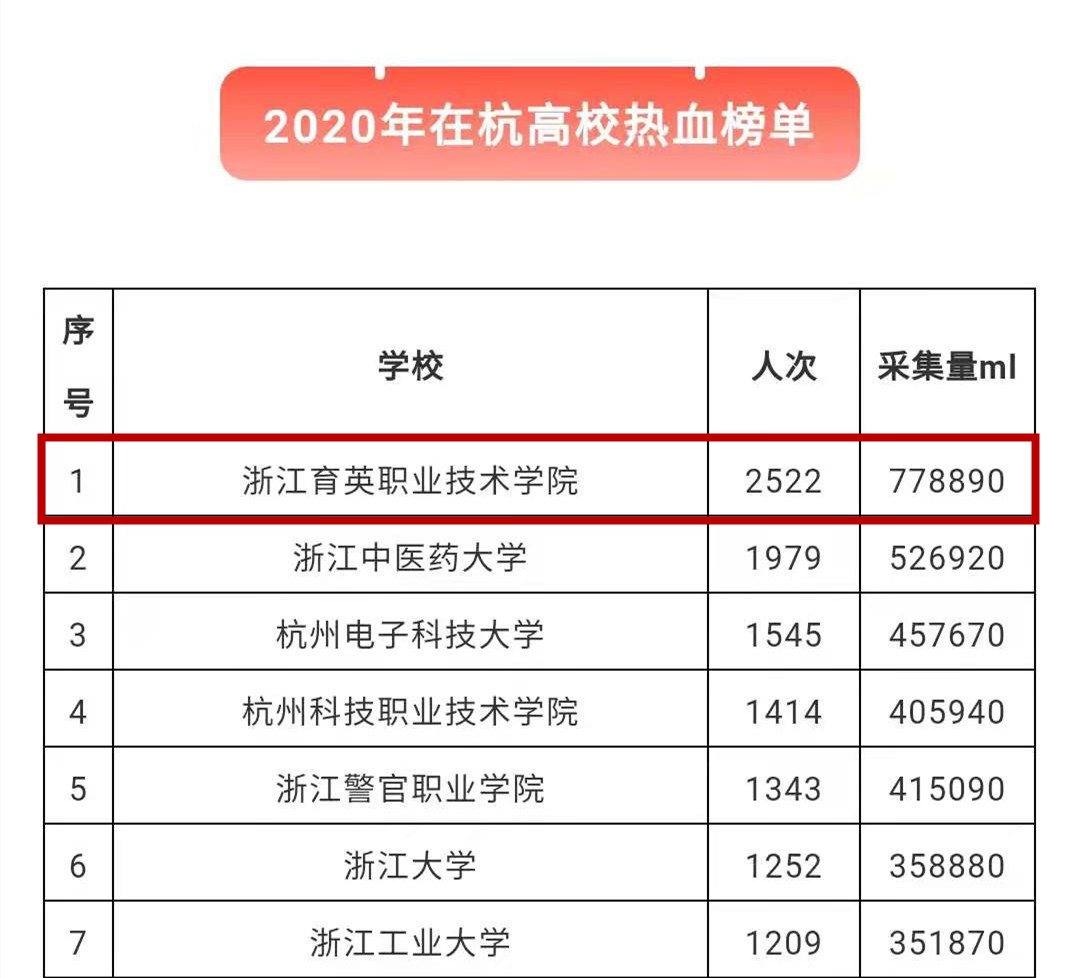 2020年12月31日,2020年在杭高校无偿献血活动顺利收官。学院以4次无偿献血,2522名师生参与,献血量778890毫升,荣登2020在杭高校热血榜单榜首。