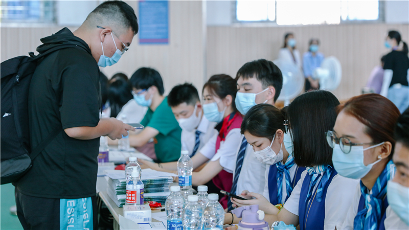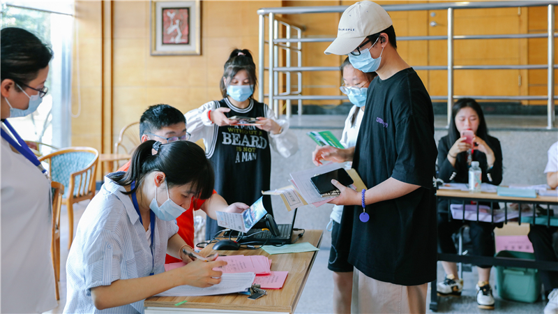 学院领导黄爱平、谢鑫、王敏、徐晓斌、崔海辉,来到迎新现场,了解新生报到注册情况,与新生和家长交流,慰问工作人员和志愿者。