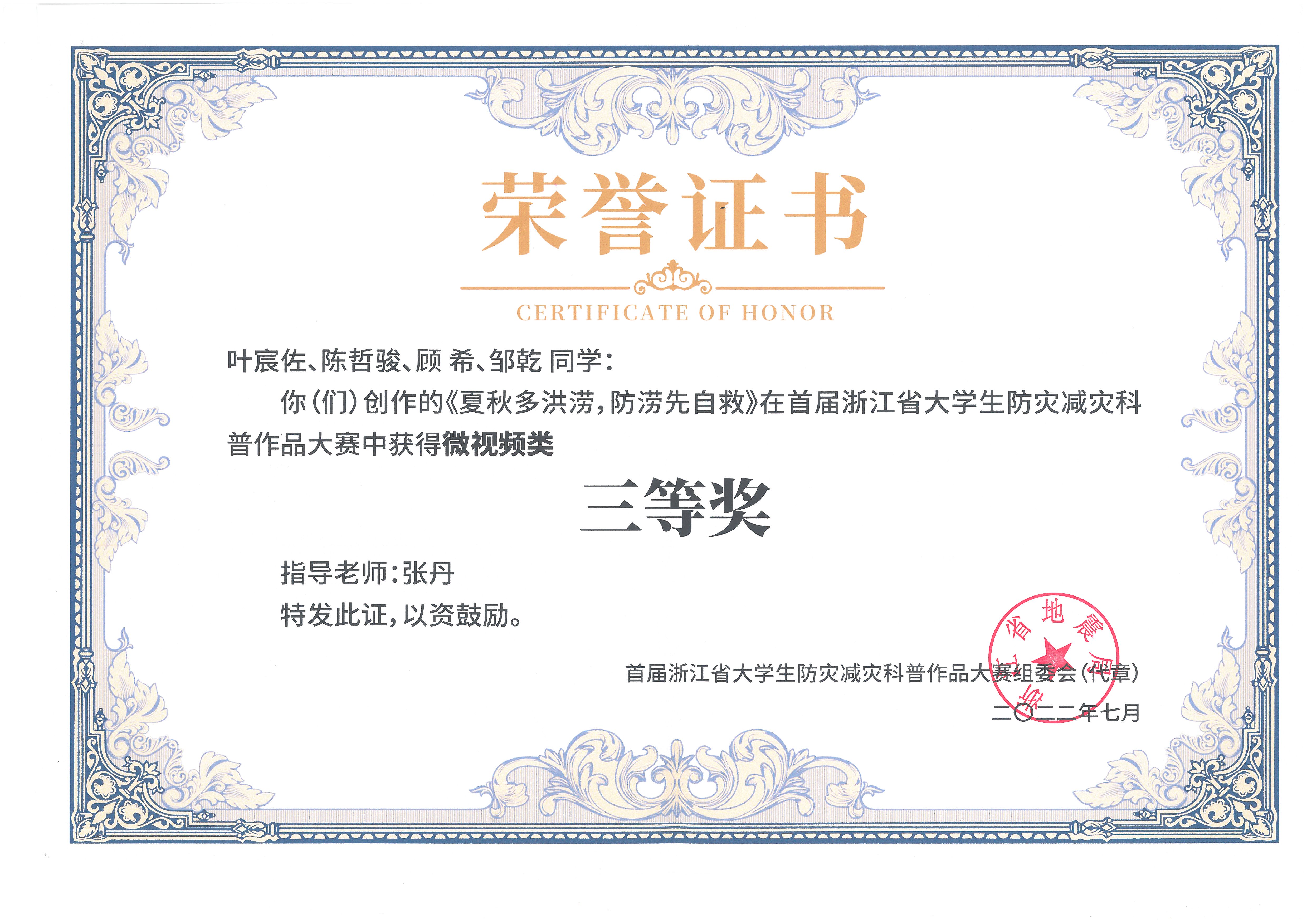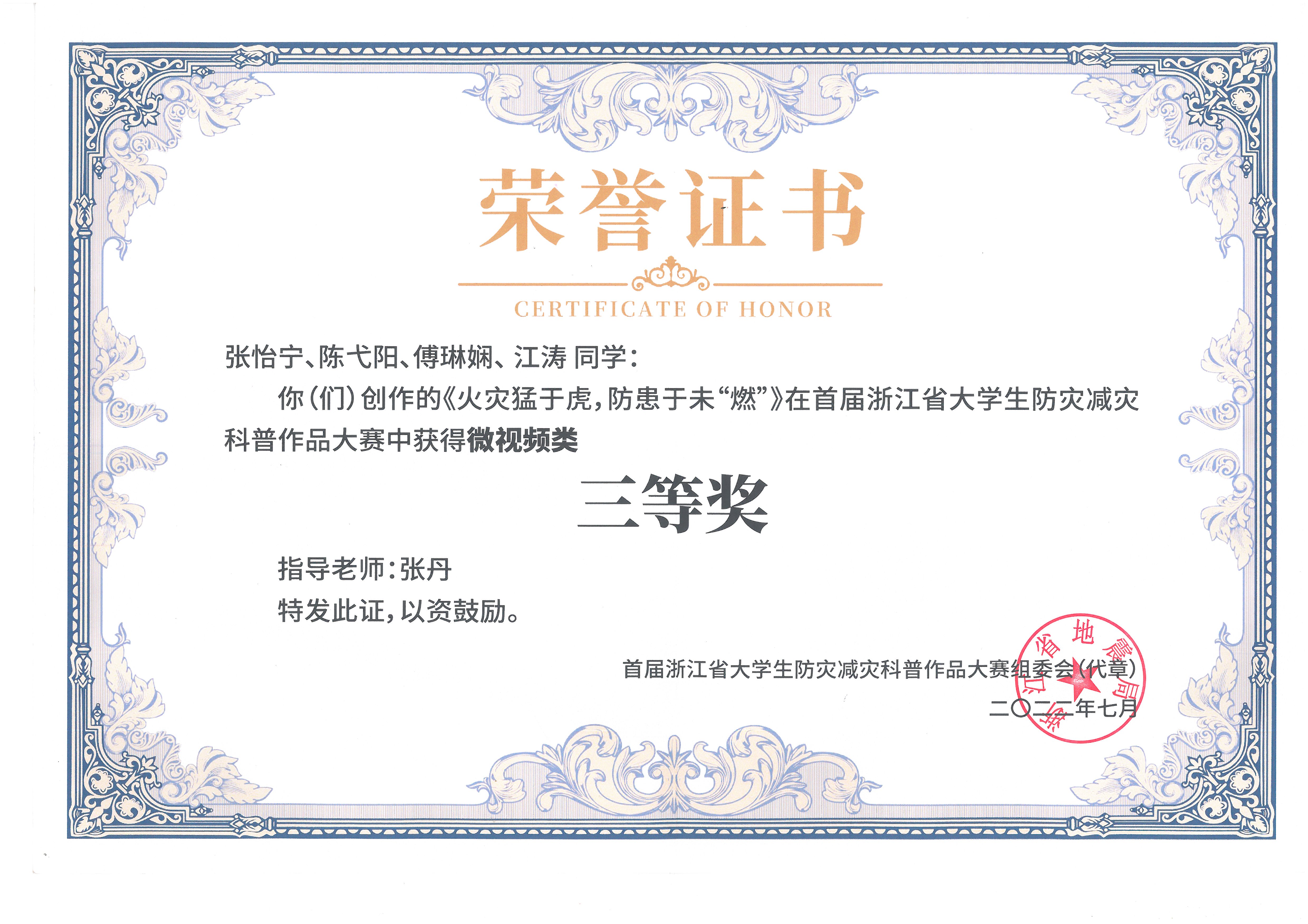 创意设计学院21环艺A班叶宸佐等学生创作的作品《夏秋多洪涝,防涝先自救》,21形象C班张怡宁等学生创作的作品《火灾猛于虎,防患于未“燃” 》荣获三等奖,指导老师为张丹。