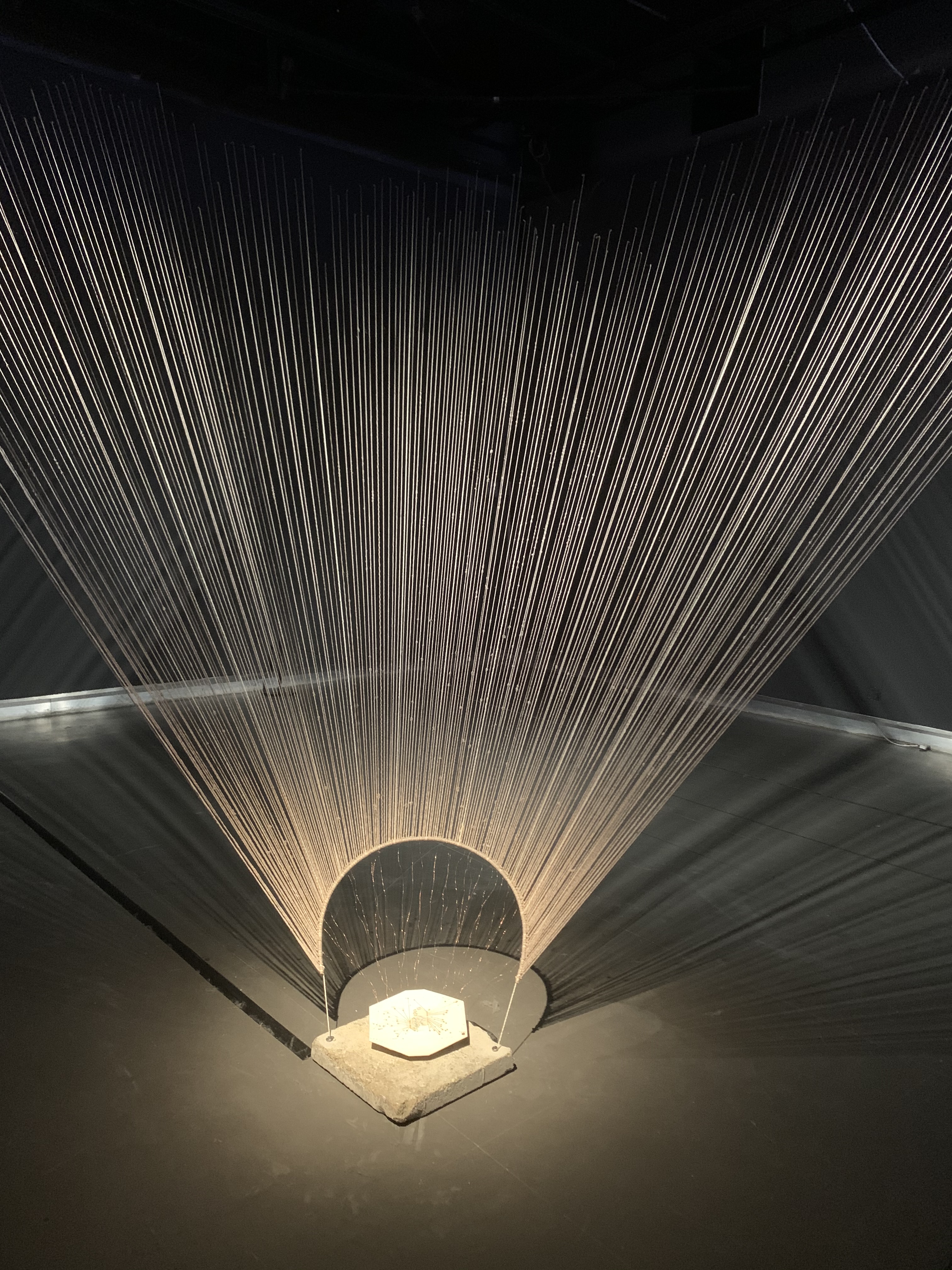不同于往常三届,第四届杭州纤维艺术三年展对“纤维”的定义超出了媒介和材料的规定性,而将其重新解释为人类文明的一种基本结构,具体指向编织的行为、关系的生成、迂回的策略等等。此展也不设分割的板块,而是以若干“线索”的形式串联全场:文/纹(文字/文化/文明),绪(情绪/思绪),线(轨迹/线条),织(劳作/身体),网(网罟/互联),结(记事/神话),综(纷纭/繁复)……这些线索彼此交缠“纽结”于空间之中,呈现为若干个供人停留、沉思的“缓存空间”。