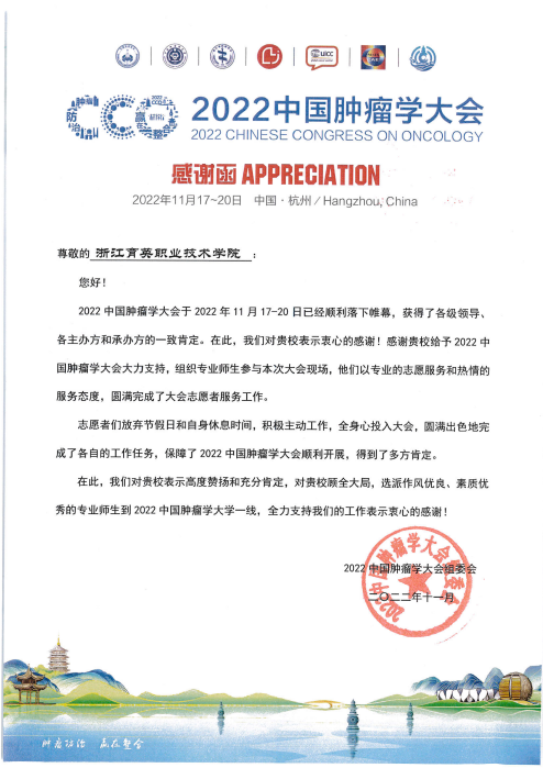 2022年11月17-20日,2022中国肿瘤学大会在在杭州国际博览中心和杭州奥林匹克体育中心举办。智慧旅游学院会展策划与管理、旅游管理,以及酒店管理与数字化运营专业241名学生参加了本次大会现场服务,并圆满完成任务。