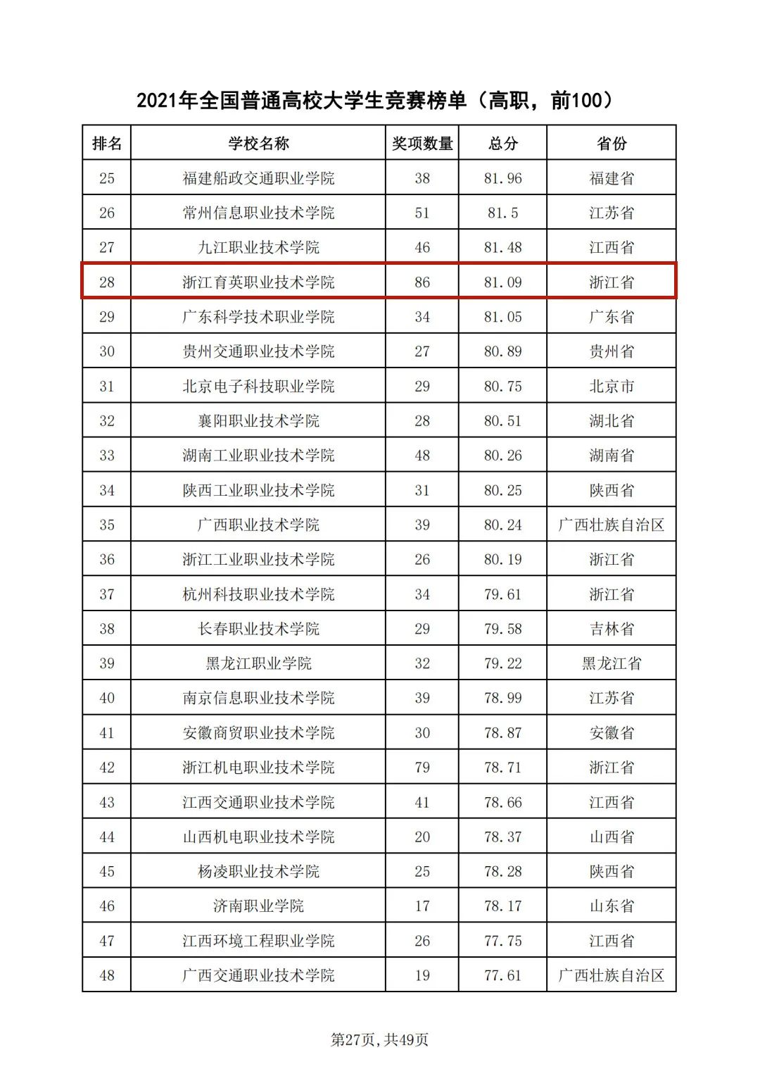 2021年全国普通高校大学生竞赛榜单(高职,前100)全国排名第28,浙江省排名第4;