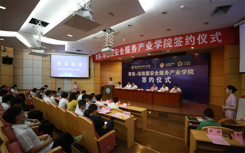 深信服浙江分公司总经理曾奇、副总经理施华钧,教育总监向锐,教育运营专家陈立豪,浙江六久科技有限公司总经理周申其,教育经理金锐,学院执行院长黄爱平,副院长王敏,信息技术分院院长严志嘉等出席,信息技术分院师生代表参加签约仪式。