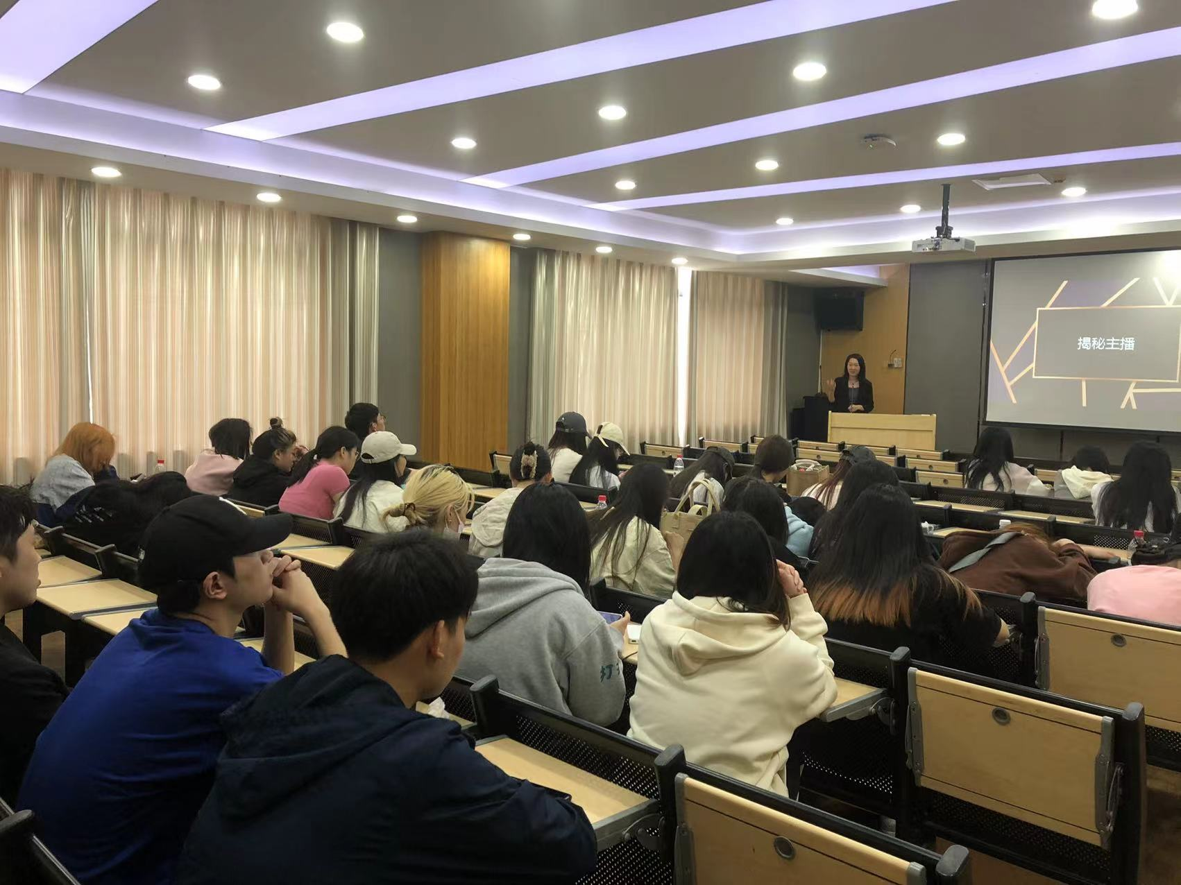 4月19号,上午3-4节课,网红毛毛姐给21形象C班做了一场主题为“解密主播”的主题讲座。毛毛姐是抖音拥有60多万粉丝量的主播,也一直在从事美容产品直播营销,毛毛姐给学生们分享了抖音的基础概念,直播间的种类的划分,抖音直播间的考核数据,如何成为一名合格的主播等等。
