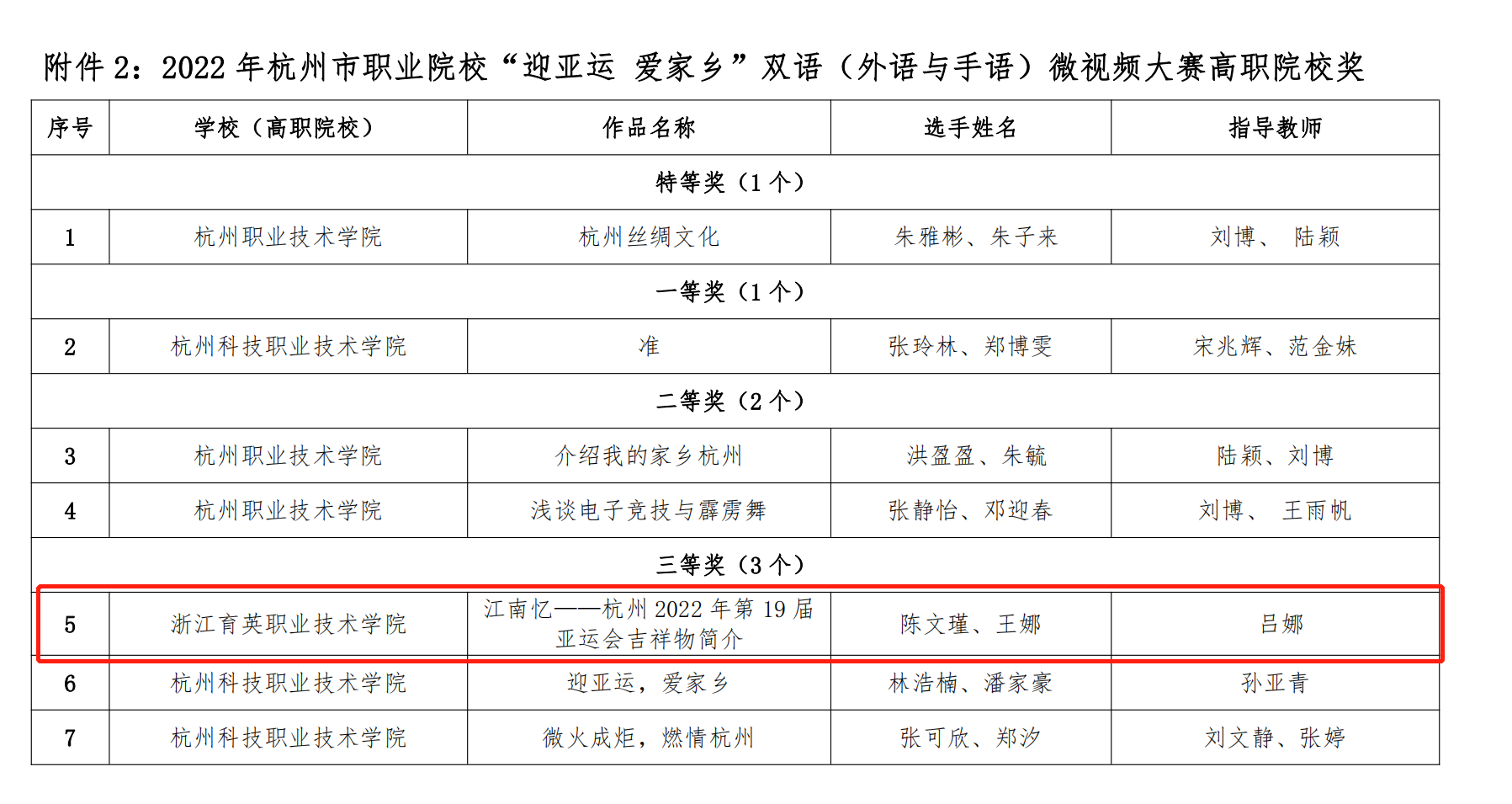 本次比赛由杭州市中华职业教育社举办,以“弘扬亚运精神,讲好杭州故事,展示职教风采”为宗旨,特别要求通过外语和手语来呈现作品。大赛高职院校组设特等奖1项、一等奖1项、二等奖2项、三等奖3项、最佳团队奖4项、优秀指导教师奖6项以及“创意、语言、制作”单项奖9项。两位同学和指导老师克服时间紧,压力大,不会手语等困难,通过自学手语,英文配音,视频剪辑等工作,最终顺利完成作品,并取得了较好的成绩!2023年杭州即将迎来亚运会,通过支持和引导学生广泛参与亚运文化活动和专业竞赛,能让同学们的素质得到全方位发展,更好地提升其文化素质水平。