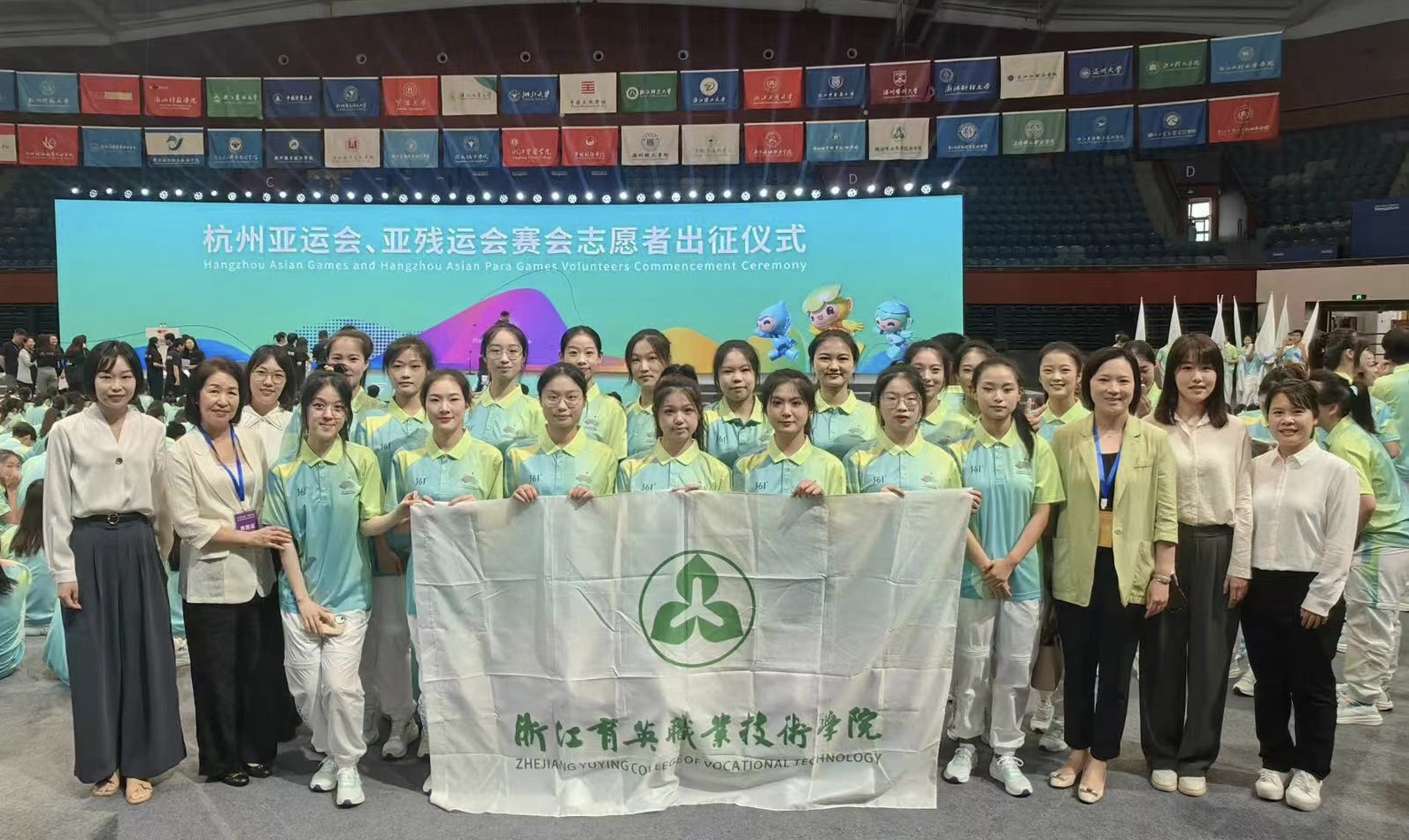 出征仪式前,常务副校长黄爱平亲切慰问志愿者代表和领队教师,并叮嘱同学们要继续弘扬我校志愿服务精神,展示出育英学子在杭州亚运会、亚残运会颁奖仪式中的青春风采。