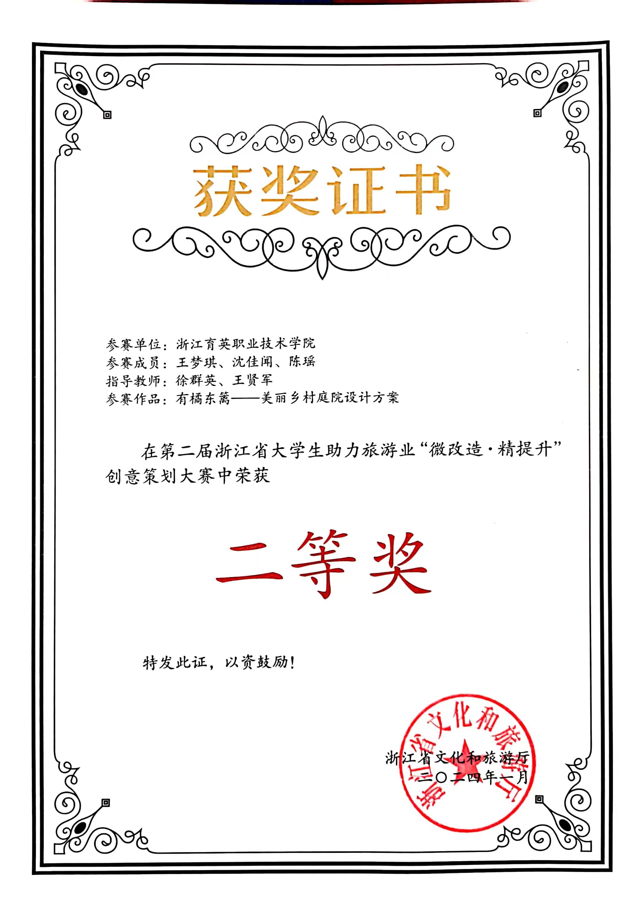 我院21环艺B班学生王梦琪、陈瑶、沈佳闻的作品““有橘东篱-美丽乡村庭院设计方案”获得了第二届浙江省大学生助力旅游业“微改造、精提升”创意策划大赛二等奖,指导教师为徐群英、王贤军。该赛主办方为浙江省文化广电和旅游厅,作为省级政府职能部门,举办“微改造,精提升”大赛,旨在推动全省文化旅游领域的创新与发展。