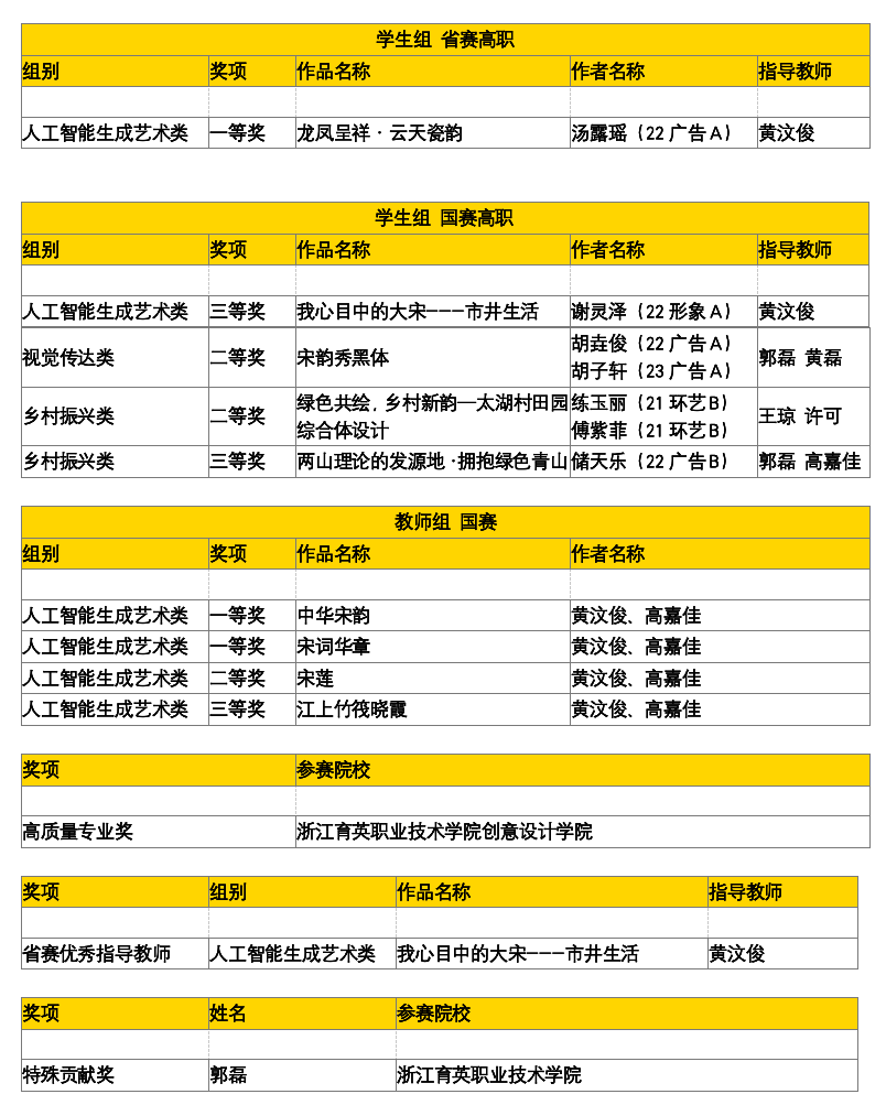 近日,在8月份结束的中国好创意暨全国数字艺术设计大赛中,浙江育英职业技术学院创意设计学院师生,在学生组国赛赛道中荣获三等奖一项;在学生组省赛赛道中荣获一等奖一项、二等奖两项、三等奖一项;在教师组国赛赛道中荣获一等奖两项、二等奖一项、三等奖一项;学院荣获高质量专业奖、优秀指导教师奖、特殊贡献奖。