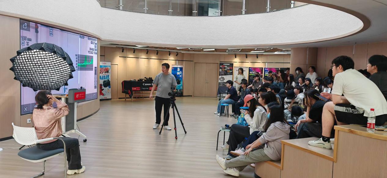 活动中,新媒体达人、前CCTV制片人邵小白导演,中影华龙的周志然老师,时光坐标的蒋舟老师等业界大咖进行了电影技术分享。他们从影视全流程技术、构图与曝光技巧实操、人物实拍技巧、影视软硬件设备介绍、灯光造型实操等方面,为师生们带来了一系列深入浅出的专业讲解。学生们听得津津有味,气氛活跃,交流互动不断。