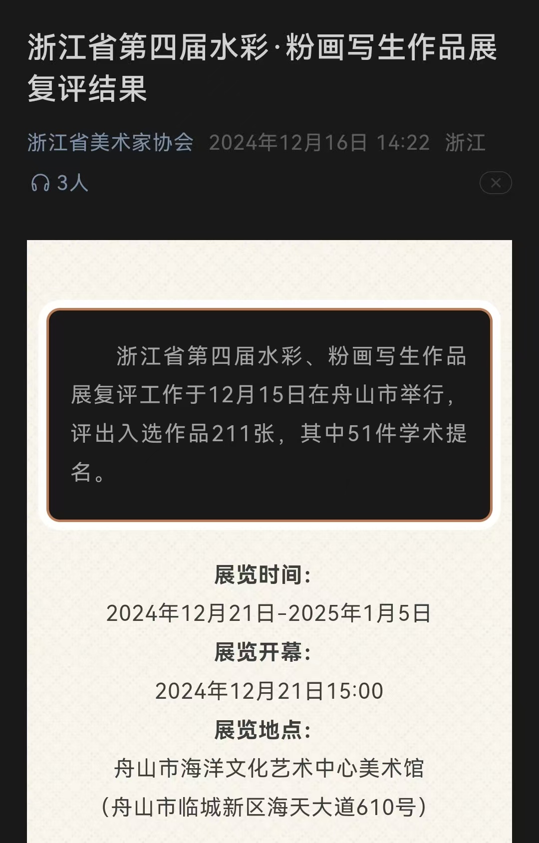 近日,由浙江省美术家协会、舟山市文学艺术界联合会、浙江省水彩画家协会联合主办,舟山市美术家协会、舟山美术馆承办的“浙江省第四届水彩(粉画)写生作品展”在舟山美术馆举办。
