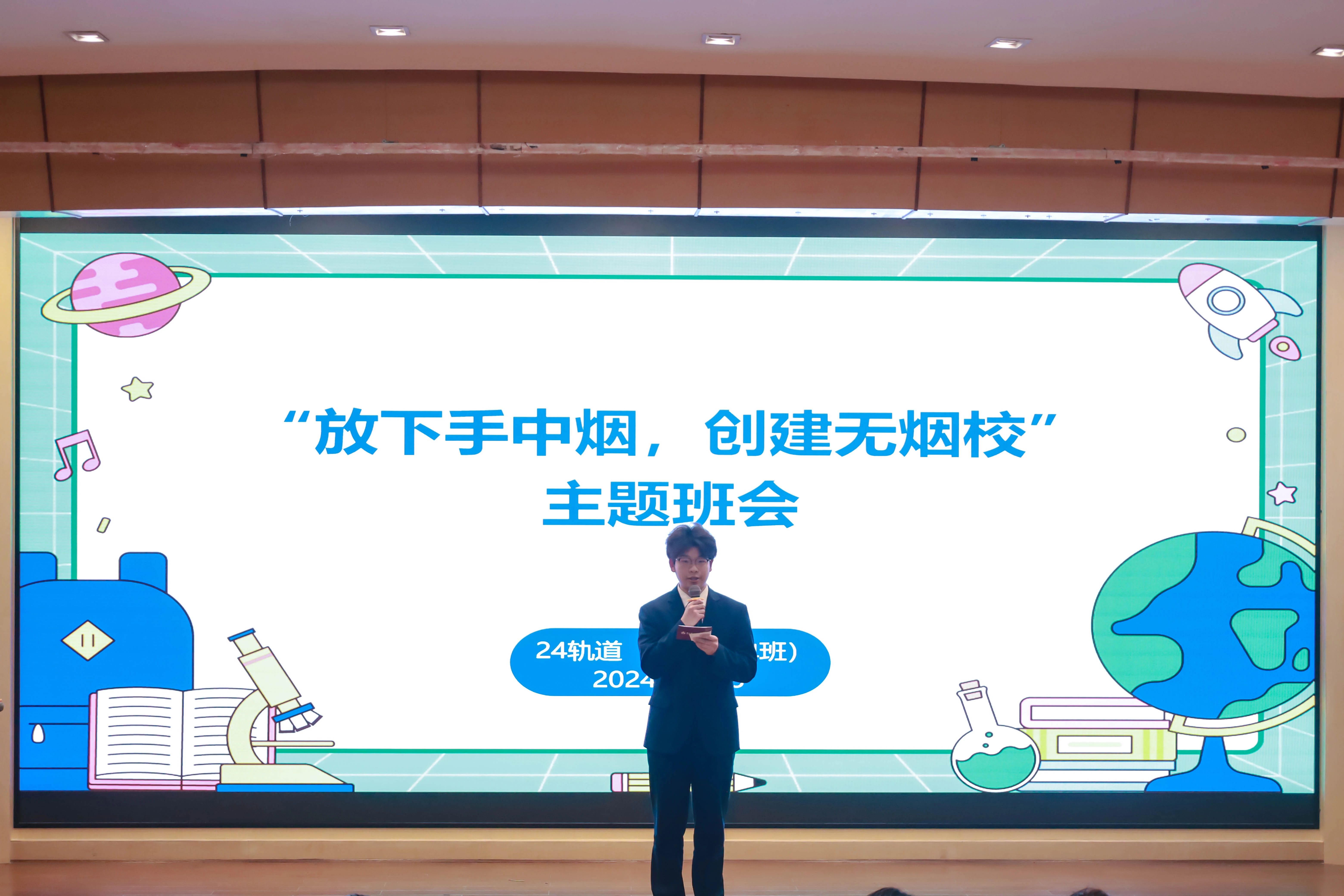 11月28日,民航交通学院24轨道F班(杭港订单)“放下手中烟 创建无烟校”主题班会在三号报告厅召开。学校党委副书记、副校长王敏,质管部主任张中新,学务部主任邬佳,学务部副主任王亦飞、民航交通学院党总支副书记赵瑞晔,部分辅导员和学务部相关人员参加本次班会观摩。