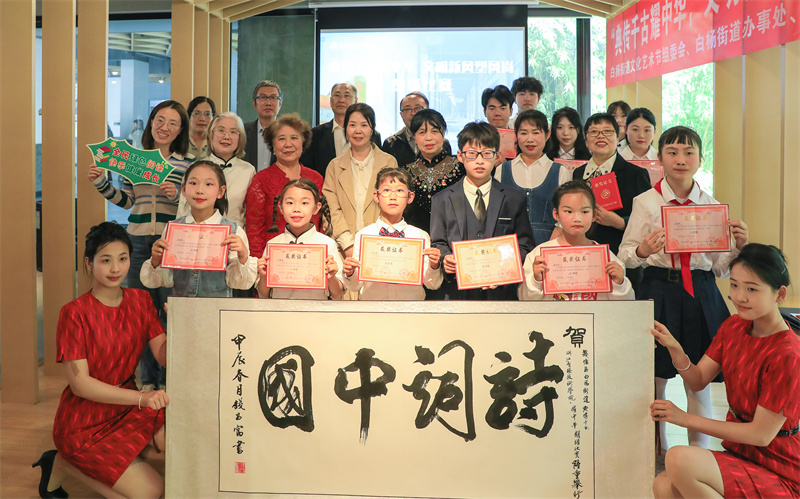 比赛现场,来自白杨街道的书法爱好者钱昌富为与会者表演了精彩的书法创作,为朗诵赛增添了书香雅致氛围。