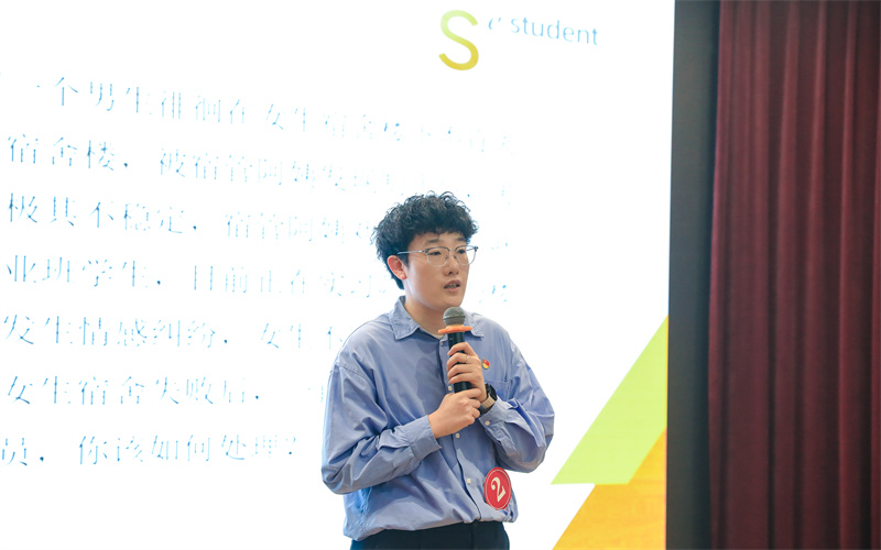 谈心谈话环节以情景再现的方式,参赛者围绕面对“失恋”“躺平主义”“寝室矛盾”等各类现实难题和日常问题,循循善诱,从容应对日常工作中与学生面对面谈话的情景,并完成谈心谈话总结,展现对学生的教育引导能力、解决思想困惑和实际问题的能力。