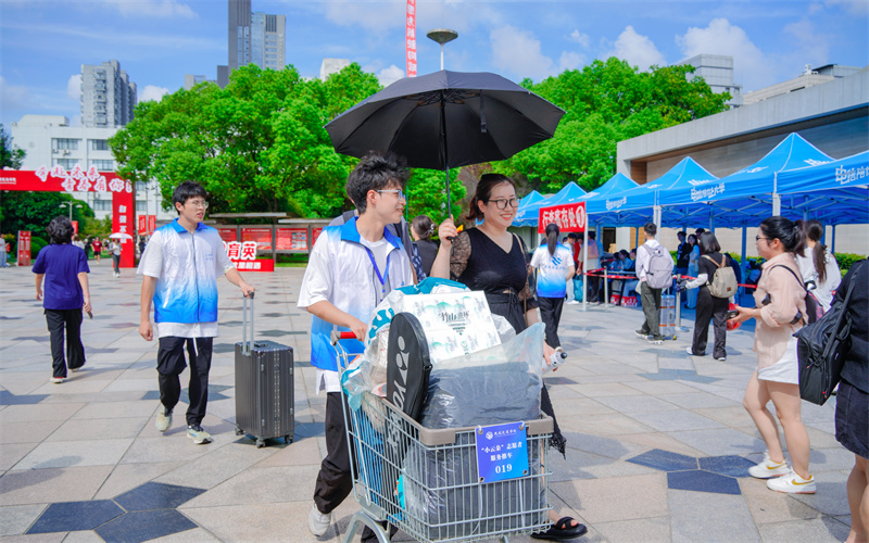 志愿者们分别在车站出口和校园内忙碌穿梭,热情地为新生提供咨询、引导、行李搬运等服务。