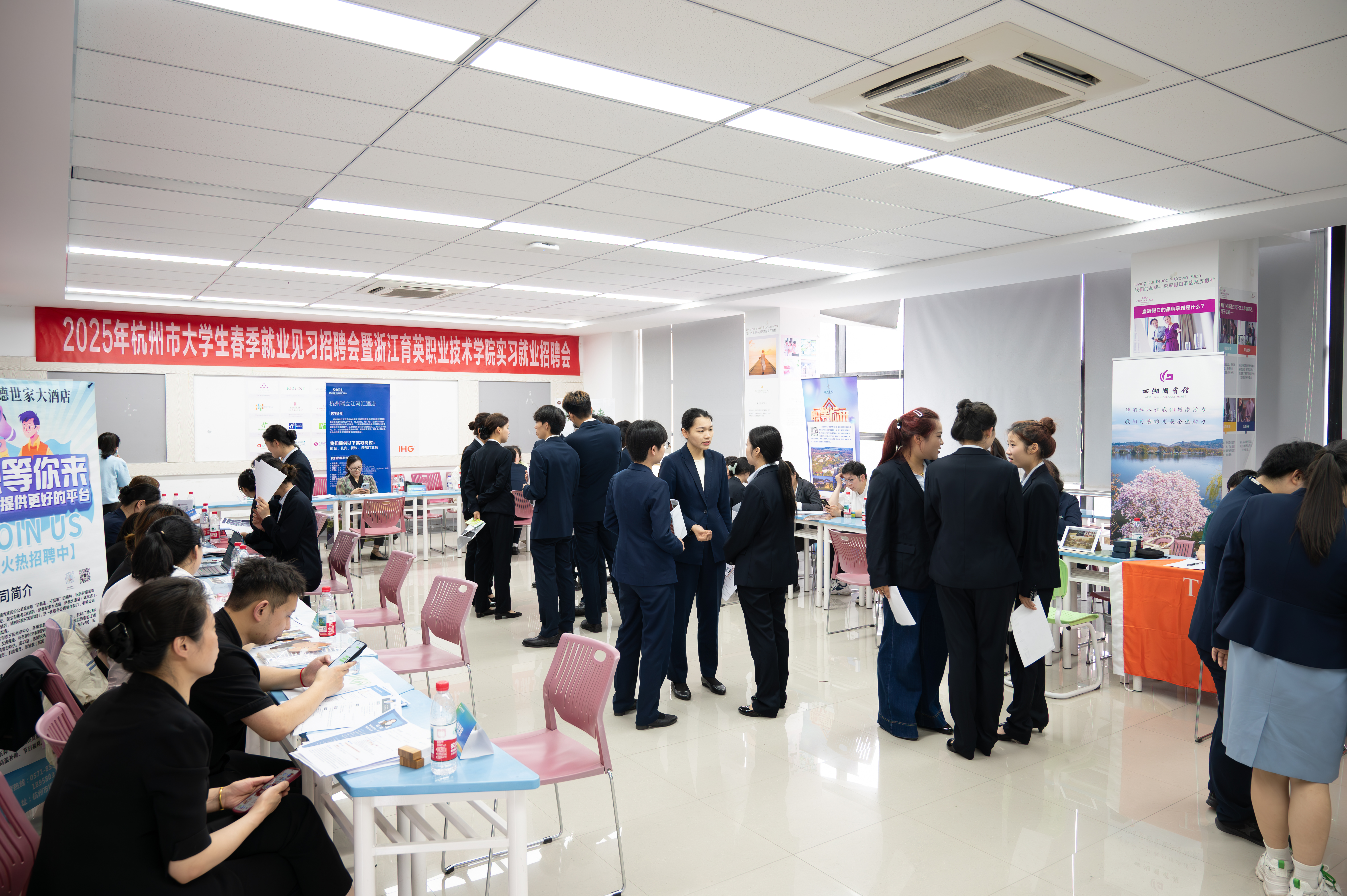 招聘会现场人潮涌动,企业展位前围满咨询和面试的学生。万豪集团、洲际集团、携程旅行、国际会展中心等企业通过宣传展板、一对一讲解等方式,全面展示企业情况与岗位招聘信息。学生们手持精心准备的简历,主动询问岗位晋升路径、实习待遇等细节,现场完成初试,与企业达成初步意向。