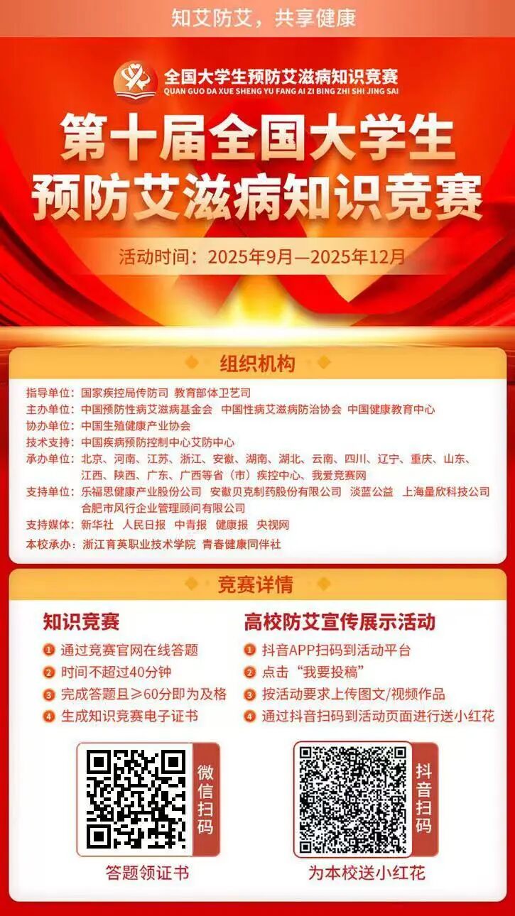 全体同学请注意!快来参加"2025年第十届全国大学生预防艾滋病知识竞赛",教育部体卫艺司、国家疾控局传防司指导,国家一级基金会与协会等主办,及格就有证书!