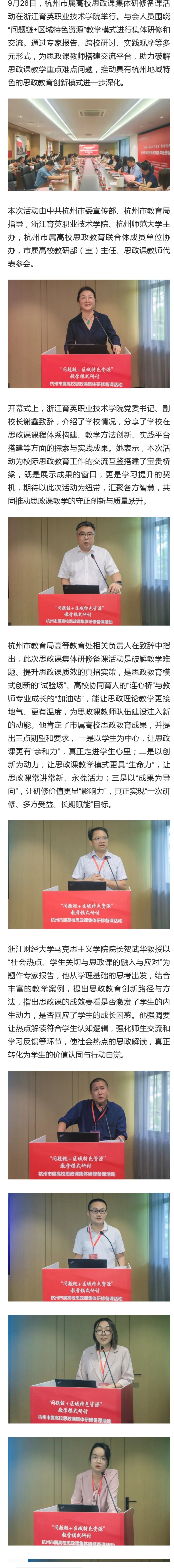 9月26日,杭州市属高校思政课集体研修备课活动在浙江育英职业技术学院举行。与会人员围绕“问题链+区域特色资源”教学模式进行集体研修和交流。通过专家报告、跨校研讨、实践观摩等多元形式,为思政课教师搭建交流平台,助力破解思政课教学重点难点问题,推动具有杭州地域特色的思政教育创新模式进一步深化。