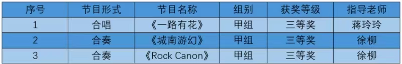 本届省大学生艺术节活动以“民族魂·中国梦”为主题,涵盖器乐、声乐及十佳歌手三个专场,共评出合唱、合奏和校园十佳歌手获奖节目450个。由蒋玲玲老师指导的声乐作品《一路有花》,徐柳老师指导的器乐作品《城南游幻》、《Rock Canon》分别荣获三等奖。