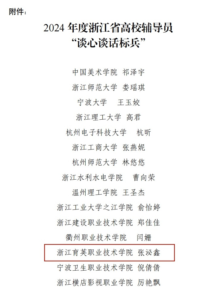 此项工作由浙江省教育厅宣传教育与统战处根据2024年度浙里思政工作台“谈心谈话”模块,综合辅导员谈话次数、覆盖率、谈话质量数据统计结果进行评选,旨在推进“立德树人”工程,进一步加强全省高校辅导员队伍建设,落实辅导员工作职责,提升学生思想政治教育的针对性和有效性。全省共有15位辅导员入选,其中5位来自高职院校。