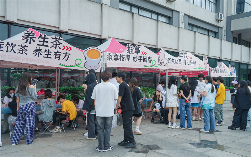 学校还为无偿献血师生举办了一场以养生为主题的配套活动。汇聚运动、艺术、养生、文化的游园会在教学区广场精彩上演,十多个特色社团打造了沉浸式养生体验活动,现场有活力四射的健美操表演、热血街舞,有汉方茶饮、艾草团扇、中药猜谜等。参与游园会的师生还有机会获得草本配方暖心茶、古法艾草手作锤、手作中药香囊、草本书香藏四季等特色物料。邀请浙江省中医院专家,提供搭脉问诊、耳穴压豆、颈椎推拿等服务,还有各类养生茶饮免费品尝,为师生们带来专业的中医体验。