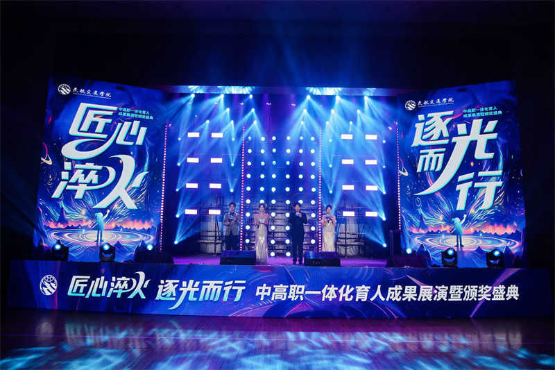 徐晓斌在致辞中表示,中高职一体化是职业教育改革的重要方向,是民航交通学院的一项重点工作、特色工程。中高职一体化不是学段叠加,而是育人基因的重组。自2021年浙江省发布《浙江省中高职一体化课程改革方案》,将“3+2”培养模式改为“中高职一体化”后,民航交通学院积极响应省、市号召,践行长学制培养、整体设计的要求,将“一体化”全面融入党建思政、课程体系、职业认知、活动育人、师资共建、考核评价等人才培养全链条、全过程,近年来在中高职一体化教育教学改革中实现了“量质齐升”的跨越式发展。这次展演既是阶段性成果的总结,更是未来协同育人的新起点。徐晓斌寄语广大学子:“从大赛擂台到人生职场,你们永远是育英的星光!”