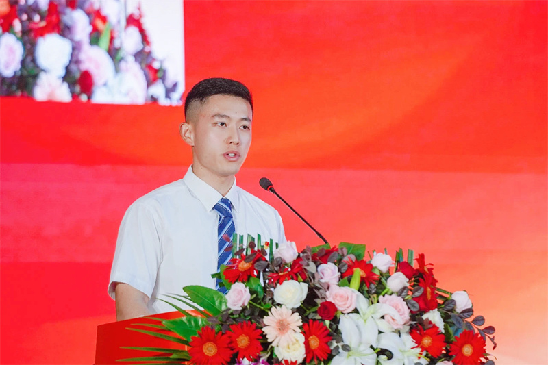 全速集团合伙人、教育事业群总经理洪德志作为校企合作单位代表发言。他介绍了全速集团基本情况和企业价值观,回顾了全速集团与育英学院近十年的合作历程,高度评价在全速集团实习就业的育英学生。他鼓励同学们,一是要胸怀大志、甘于奉献、敢于担当,努力成为对国家和社会有价值的有志之士;二是要保持终身学习的意识和能力、积极拥抱新技术、与时俱进、以创新的思维和行动引领未来职场;三是要不断探索,敢于打破常规,勇于创新,将个人的创新才能转化为推动企业发展和社会进步的动力。他说,梦想需要追逐,君子当自强不息,不要在内卷中乱了方寸,不要在焦虑中陷入迷惘。坦诚面对自己,他人和世界,就会遇到自己的花期。